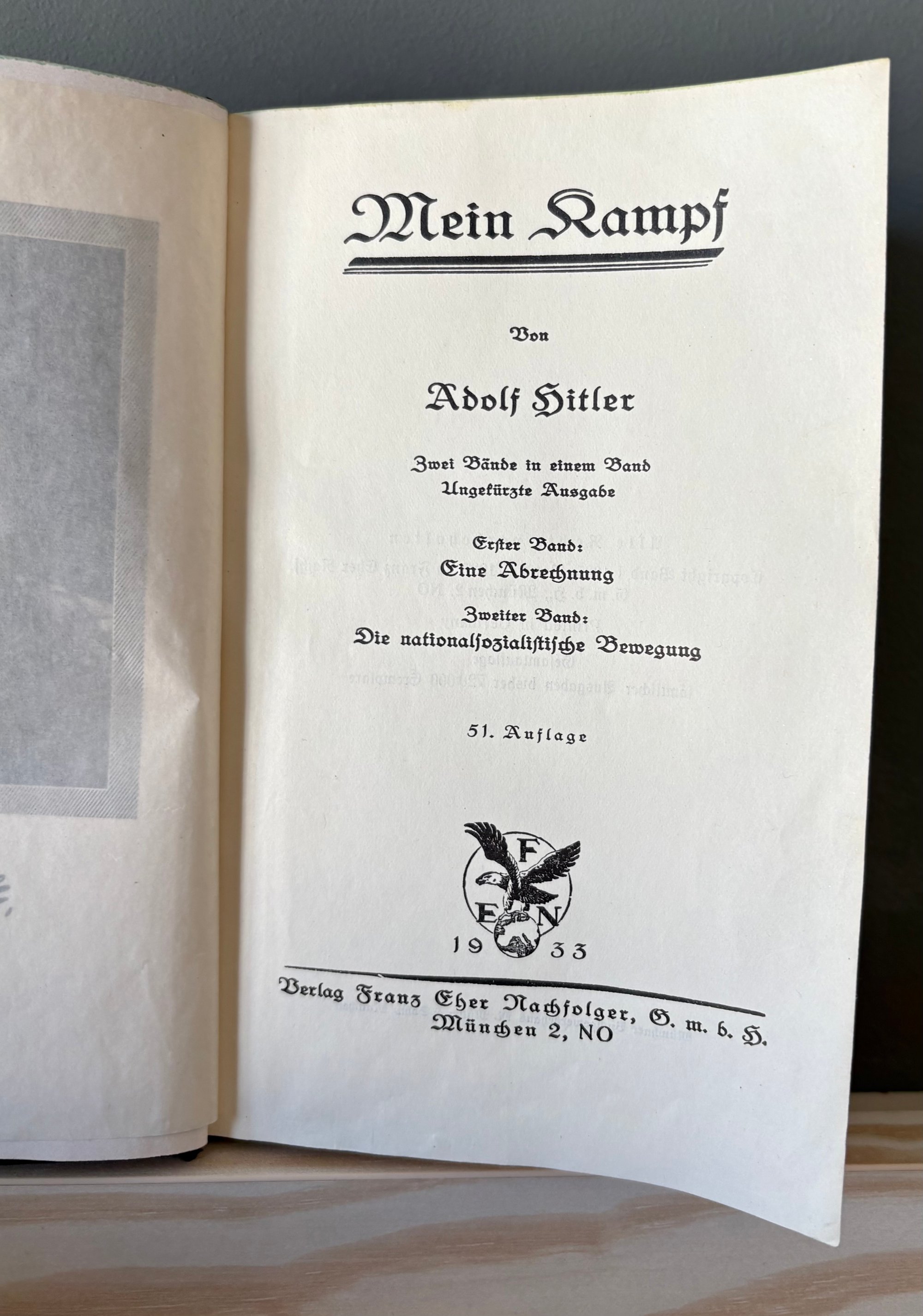This is an authentic 1933 early edition of Adolf Hitler's Mein Kampf, printed the year of his ascension to power (1933). The book was published by the NSDAP's central publishing company, Franz Eher Nachfolger (Munich).