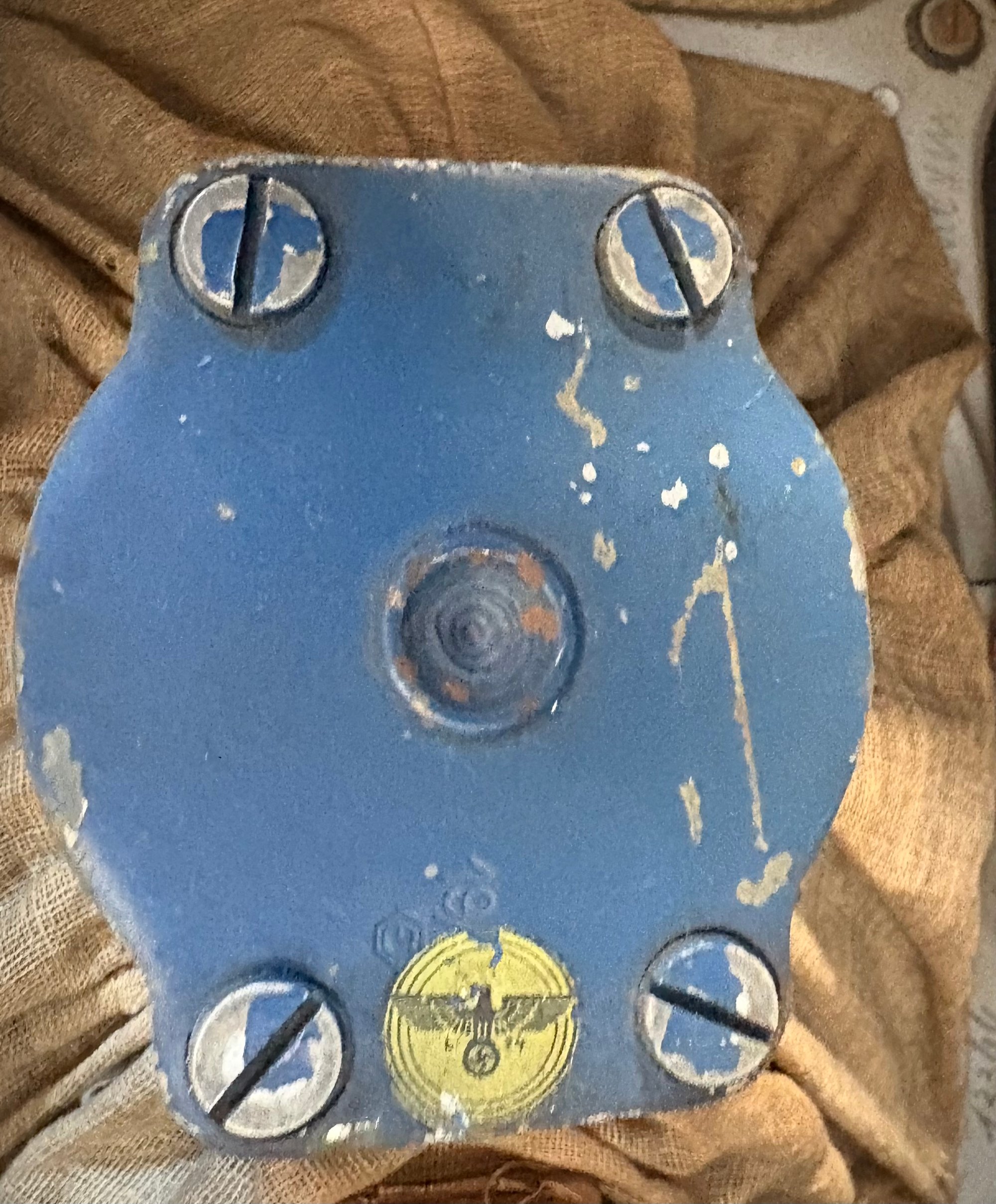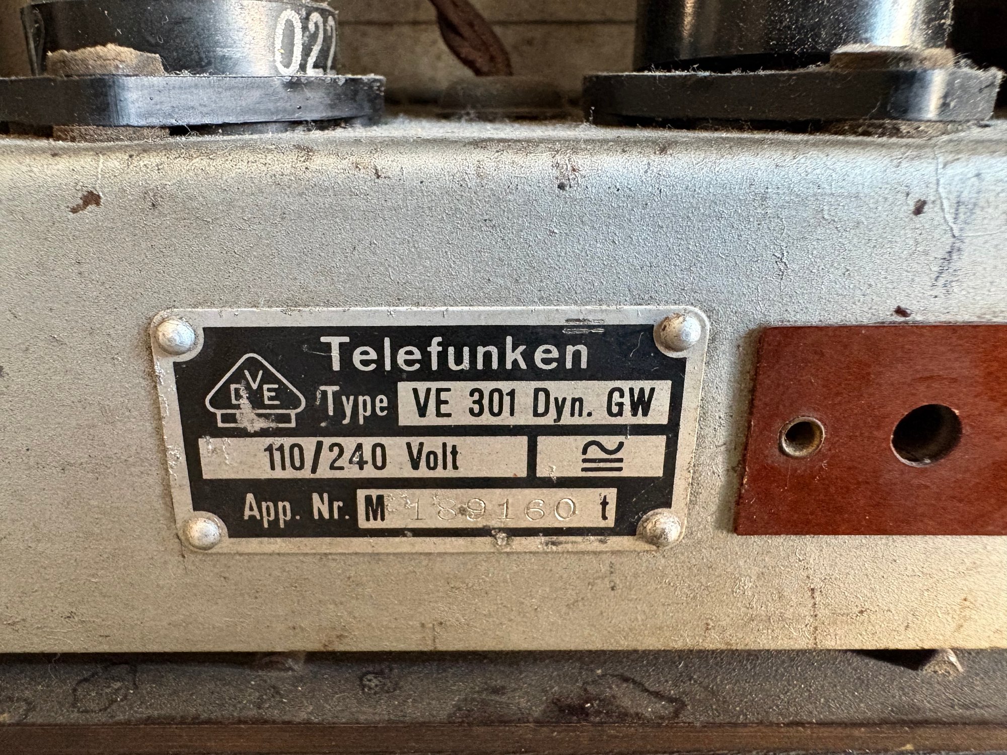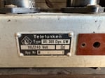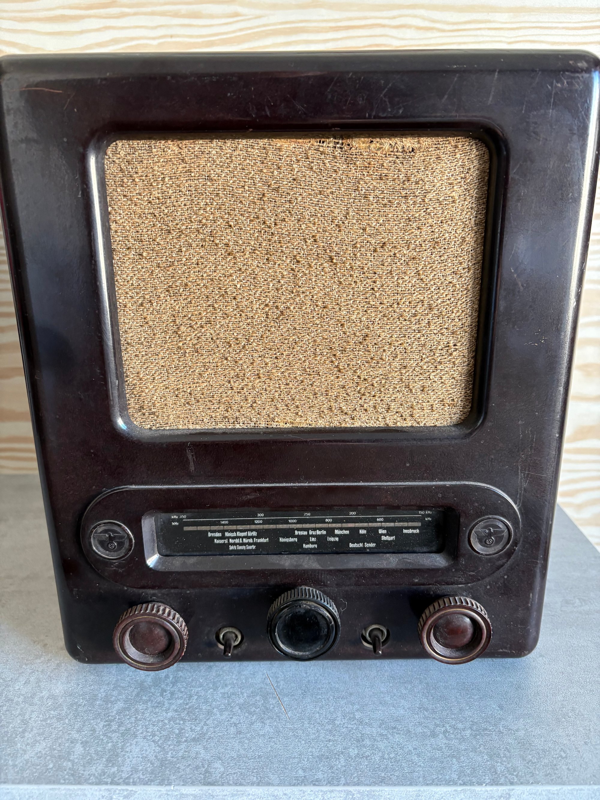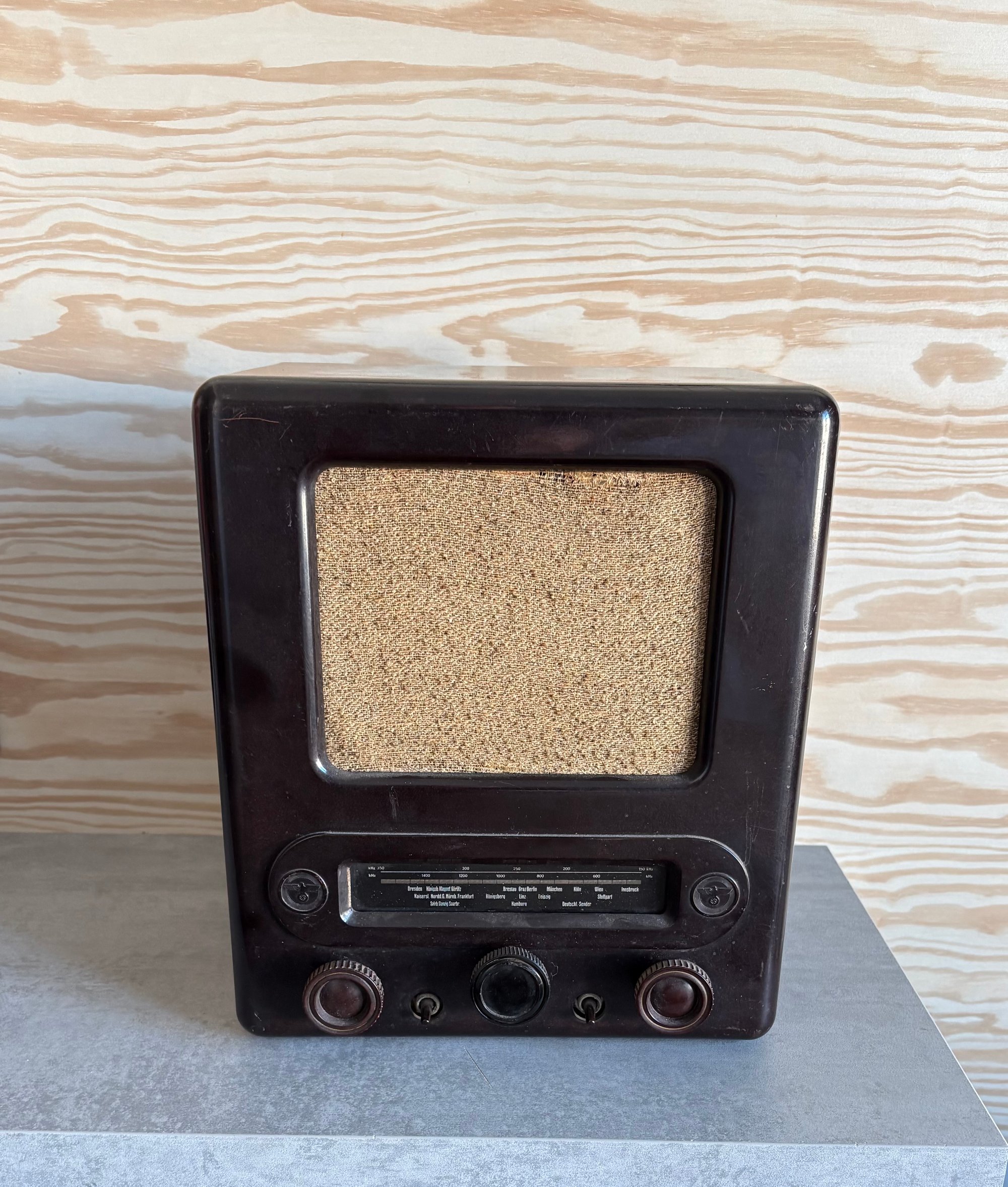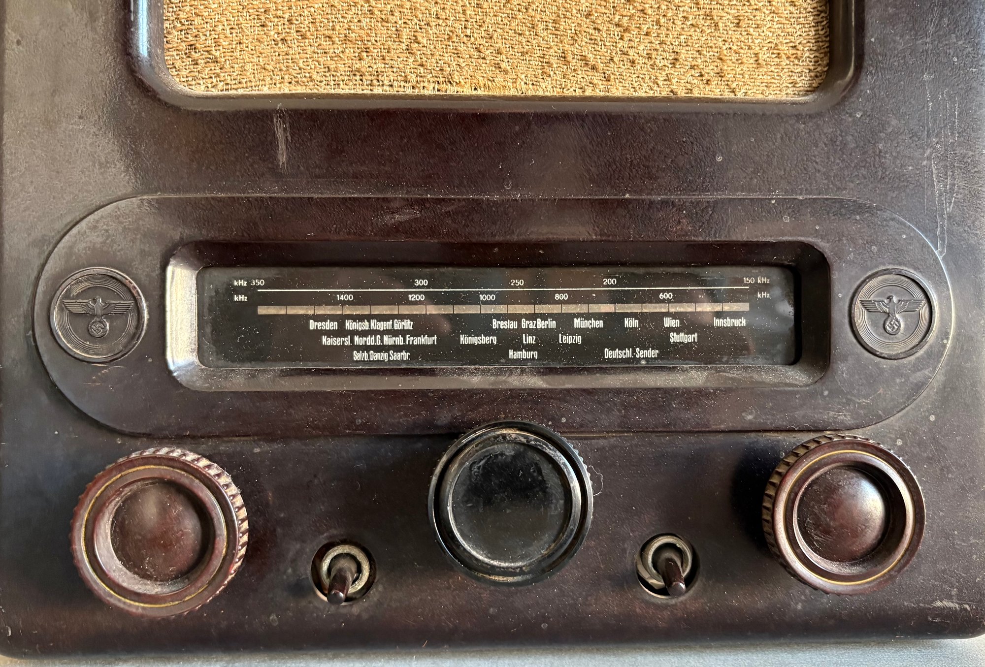 Dark (Brown) bakelite housing with balanced dials on either side. Flanking the illuminated display are discs which depict the Nazi Germany eagle & swastika symbol. The internal components all seem to be present and the plug is a post era replacement. The speaker housing similarly contains the Nazi Germany eagle and swastika stamp with maker markings present.