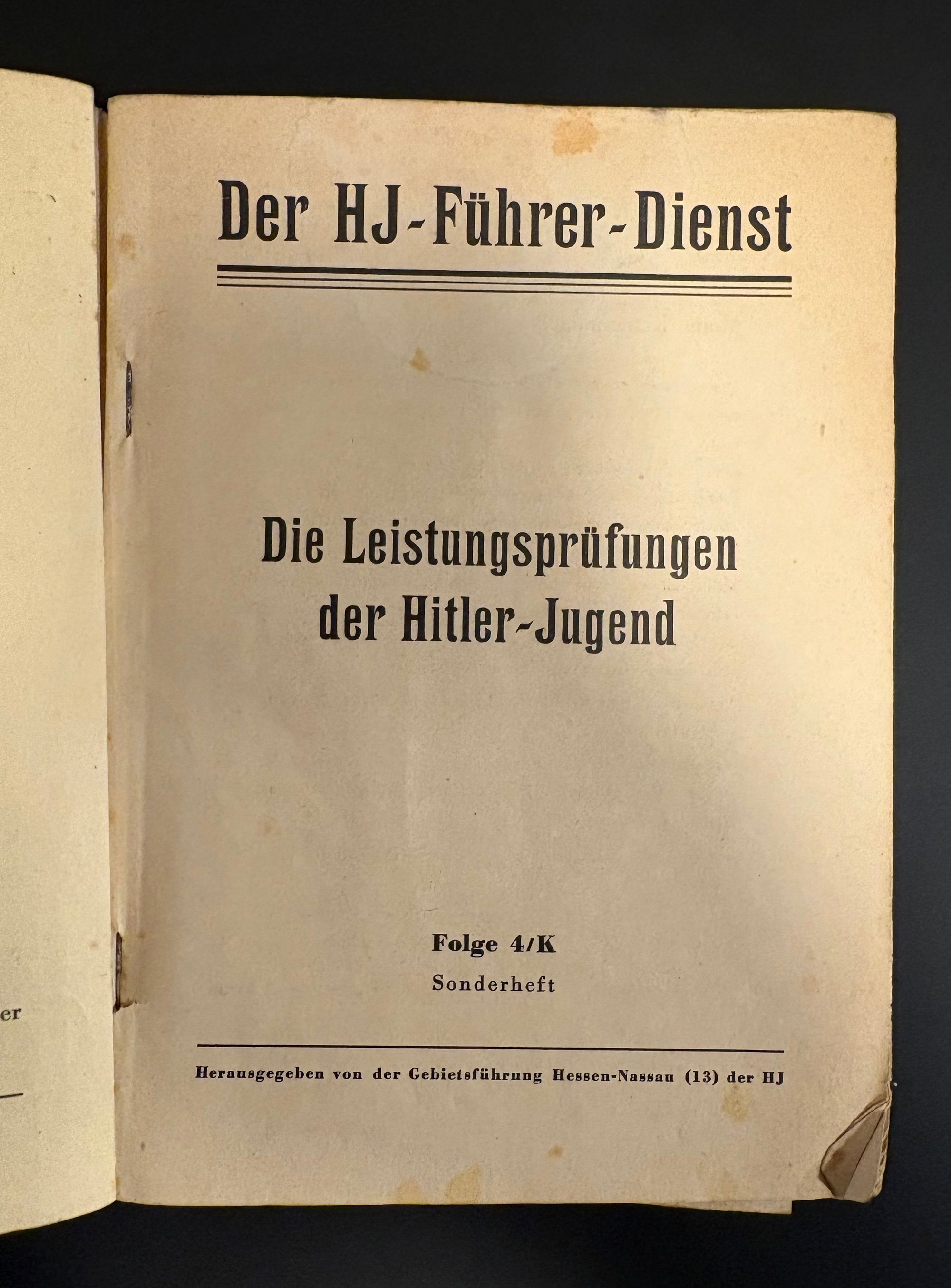 This is an authentic Nazi Germany service publication for the Hitler Youth (Hitler-Jugend or HJ). The title, "Der HJ-Führer-Dienst" translates to The HJ Leader Service & specifically applies to the region of Gebiet Hessen-Nassau 13 (District 13, Hessen-Nassau), which was headquartered in Frankfurt am Main.