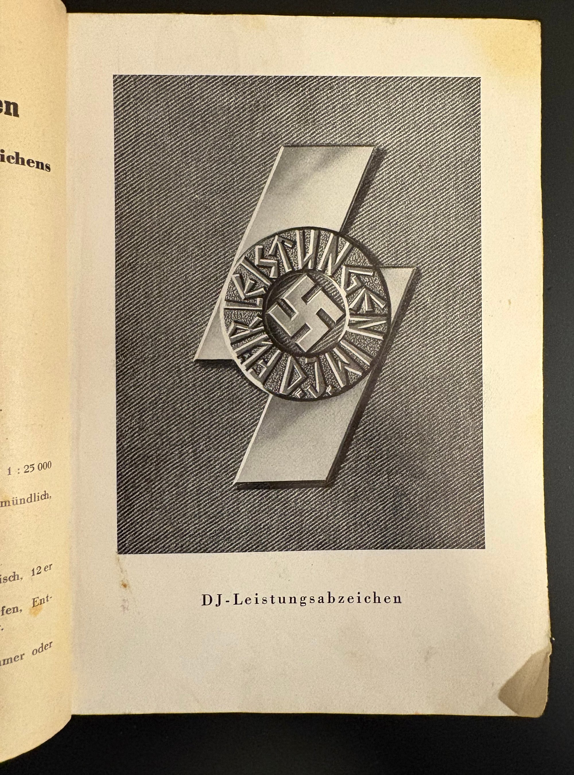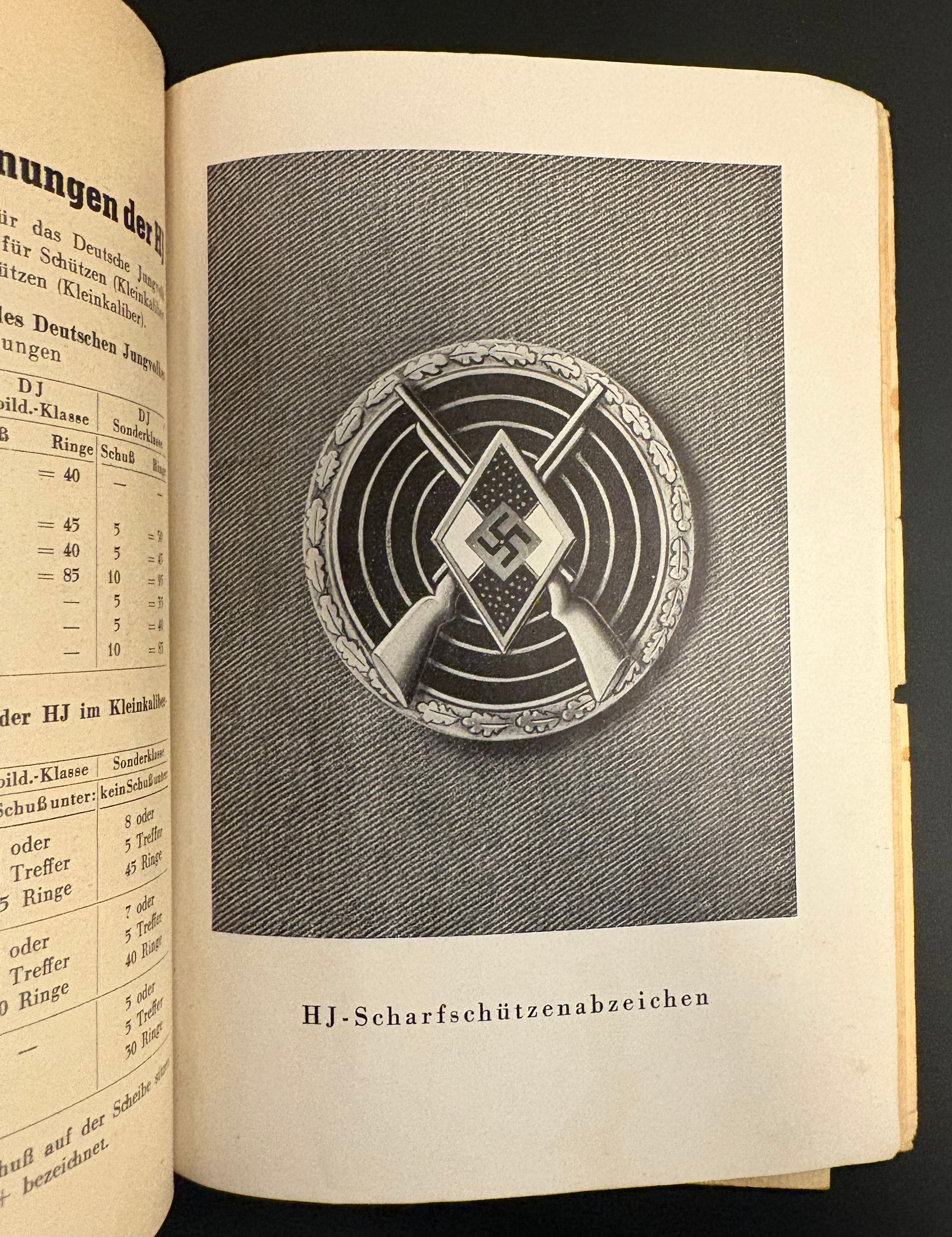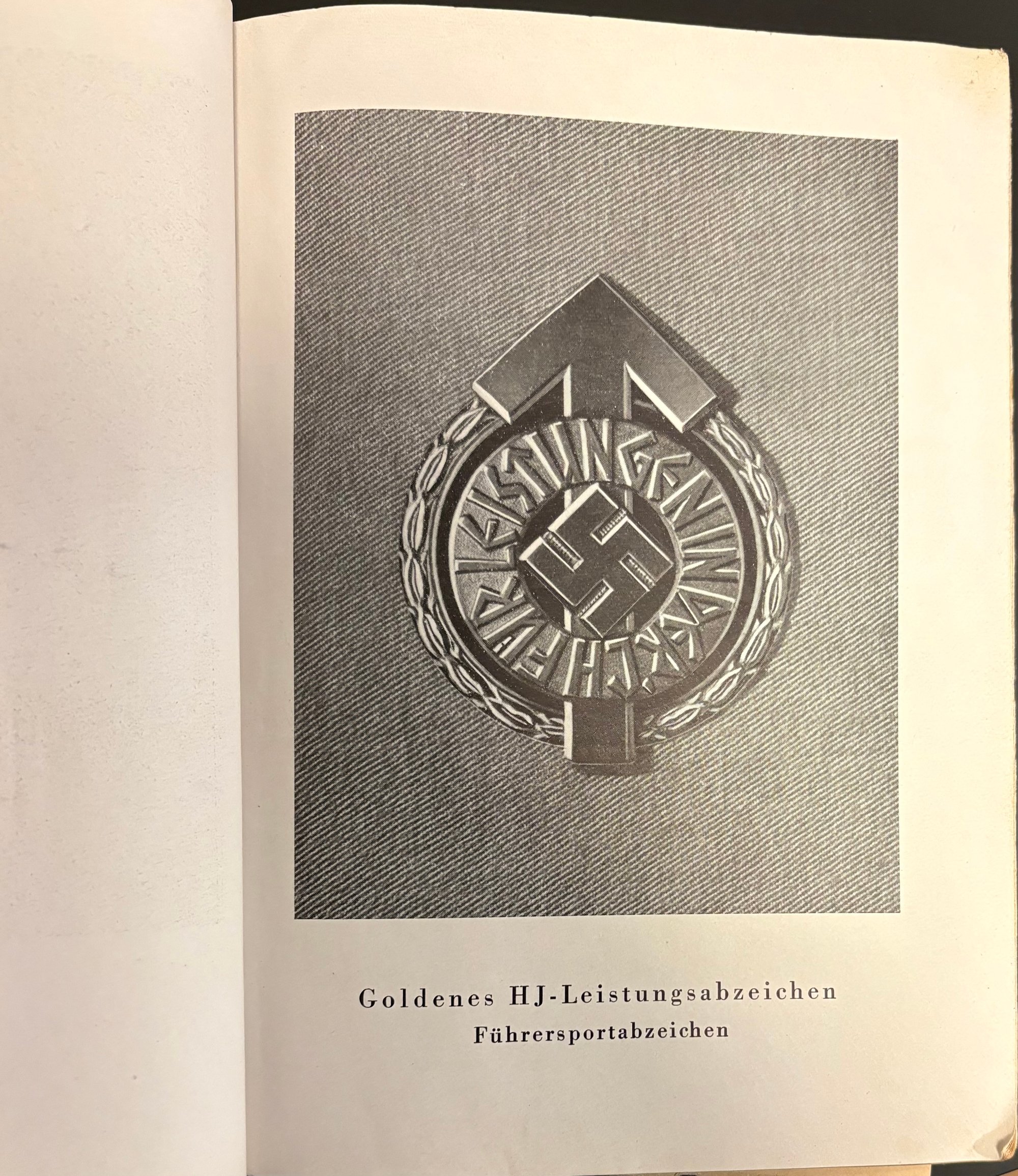 The booklet is broken down into various categories of performance tests such as, Youth achievement badge (leadership sports badge), Sharpshooter Badge, Performance badge, and many more. Once completion of the requirements, the hitler youth member would receive the badge which is displayed at the beginning of each of the categories.
