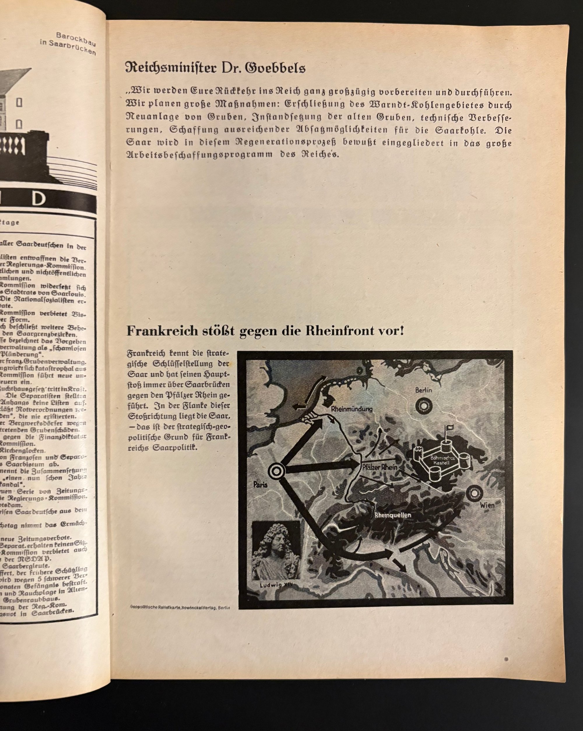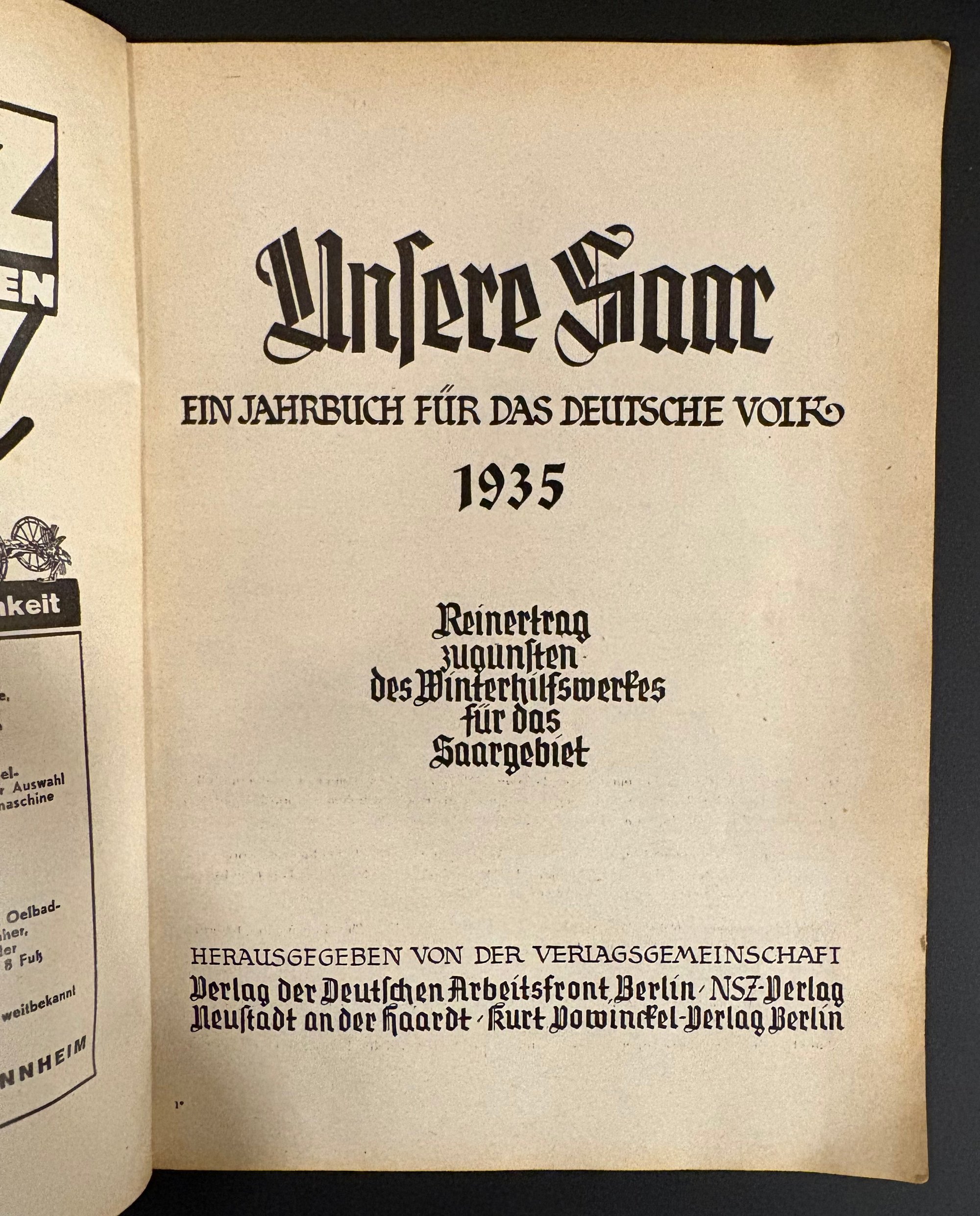It was published jointly by the Verlag der Deutschen Arbeitsfront (Berlin) and the NSZ-Verlag. The net proceeds (Reinertrag) were donated to the Winterhilfswerk (Winter Relief Fund) for the Saar region.