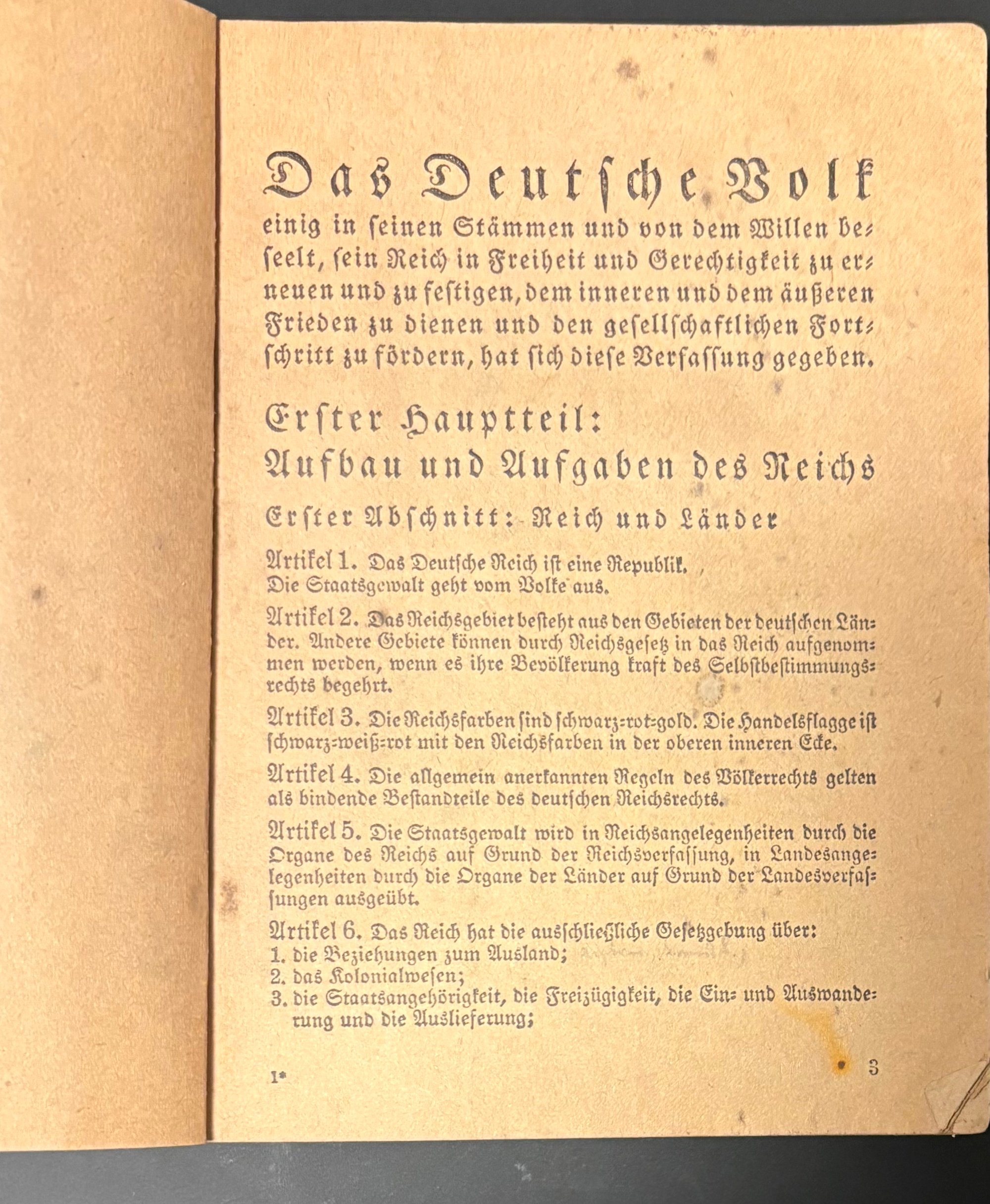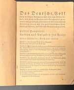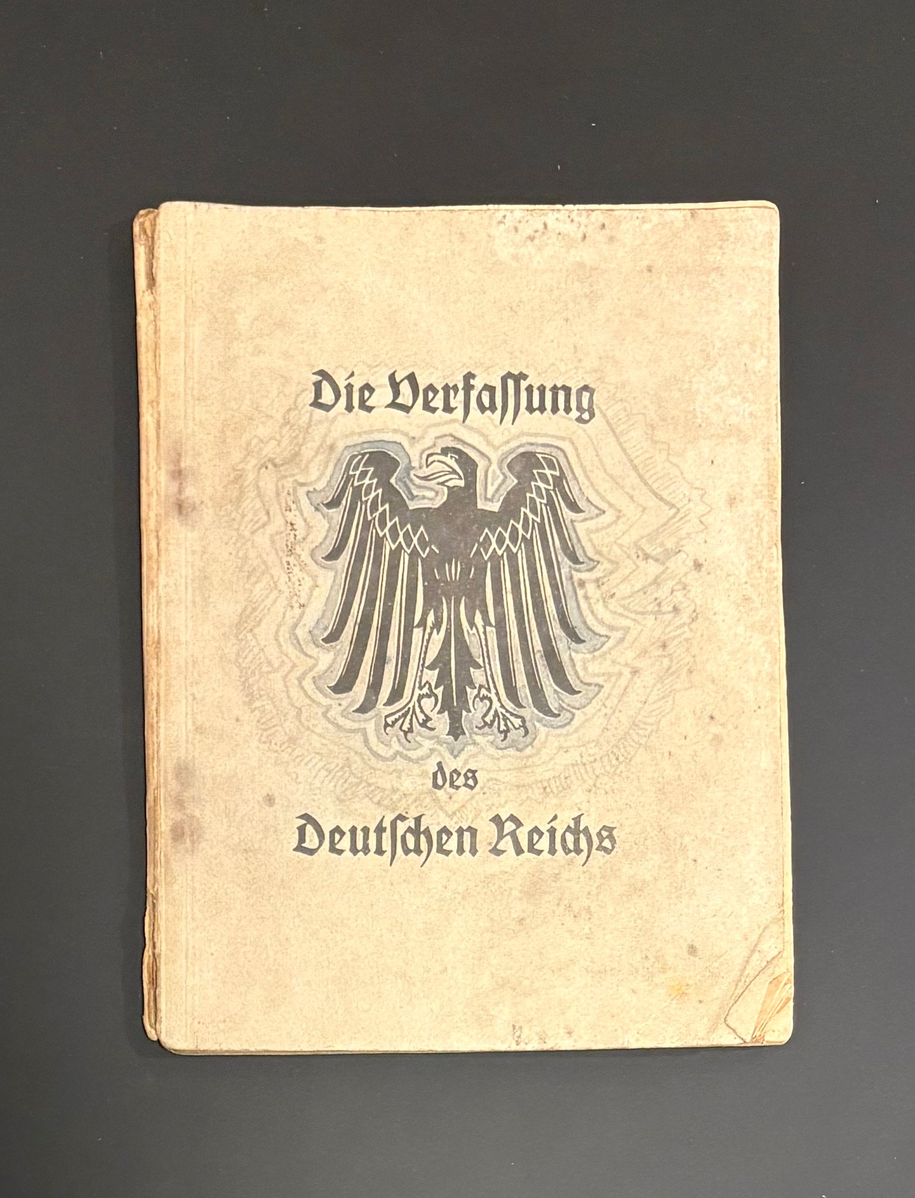 This is an authentic post-WW1 booklet of the Weimar Constitution (Die Verfassung des Deutschen Reichs), which was the governing document of Germany from 1919 to 1933. It was adopted on August 11, 1919 & established Germany as a federal semi-presidential republic. The front cover translates to, "The Constitution of the German Reich.".