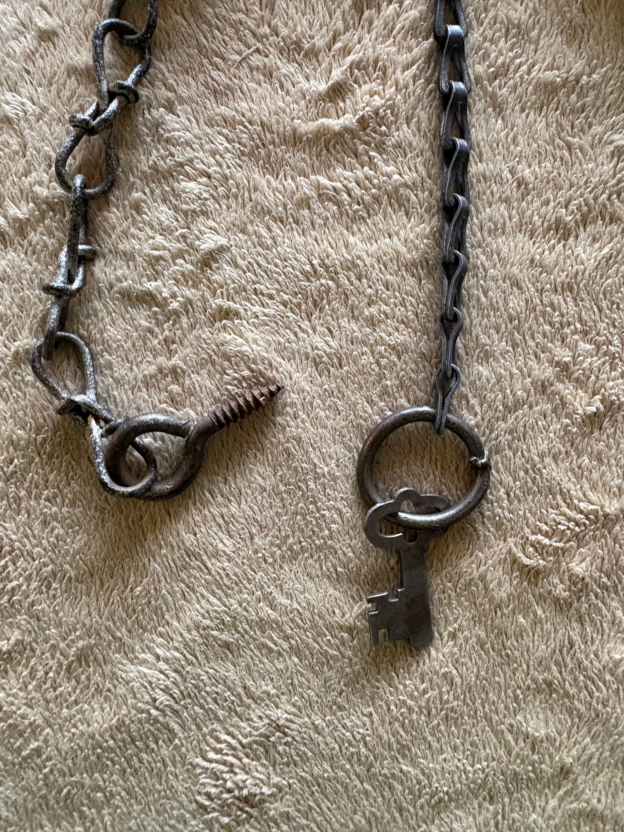 This is an authentic period antique railroad switch padlock w/original key & chain, manufactured by Sargent & Co., an American hardware manufacturer founded in the 19th century. These locks were used by rail companies to secure track switches. The long chain and attached eye screw allow the lock to be permanently tethered to a post or rail structure so it isn't lost when unlocked.