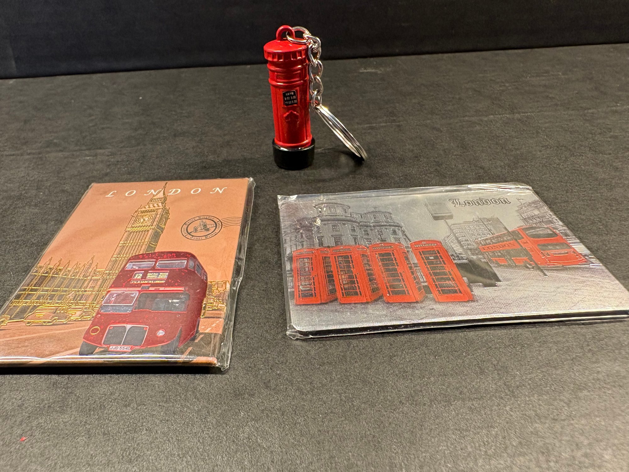 This sale features a trio of London Iconic Landmarks souvenirs - 2x refrigerator magnets (red phone box & red bus) & 1x key chain (letter post pillar).