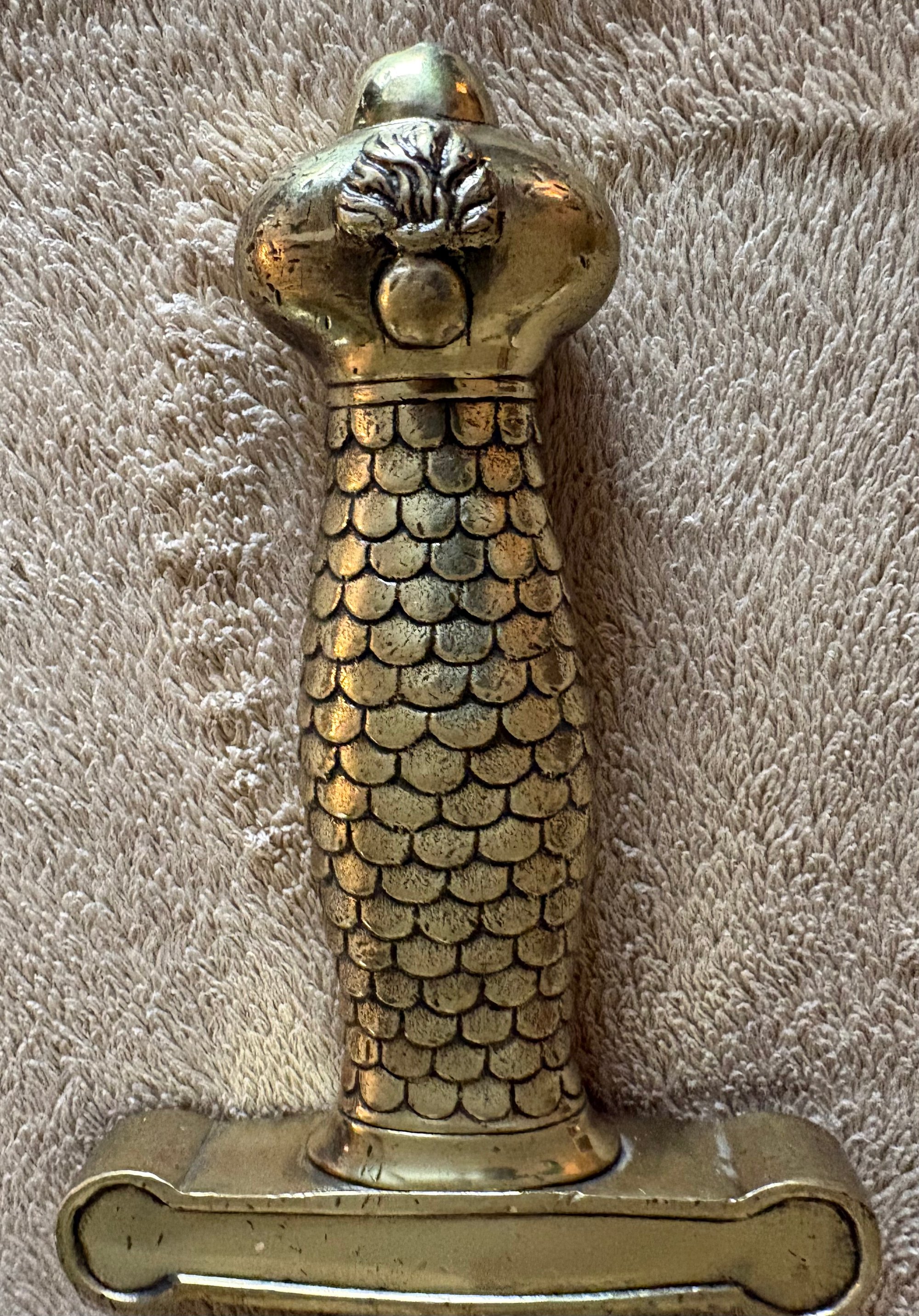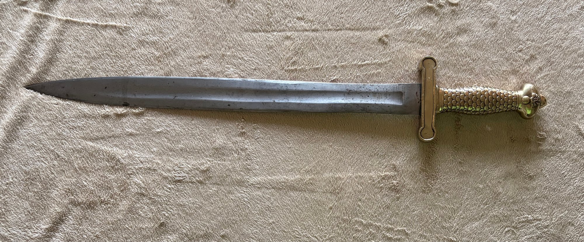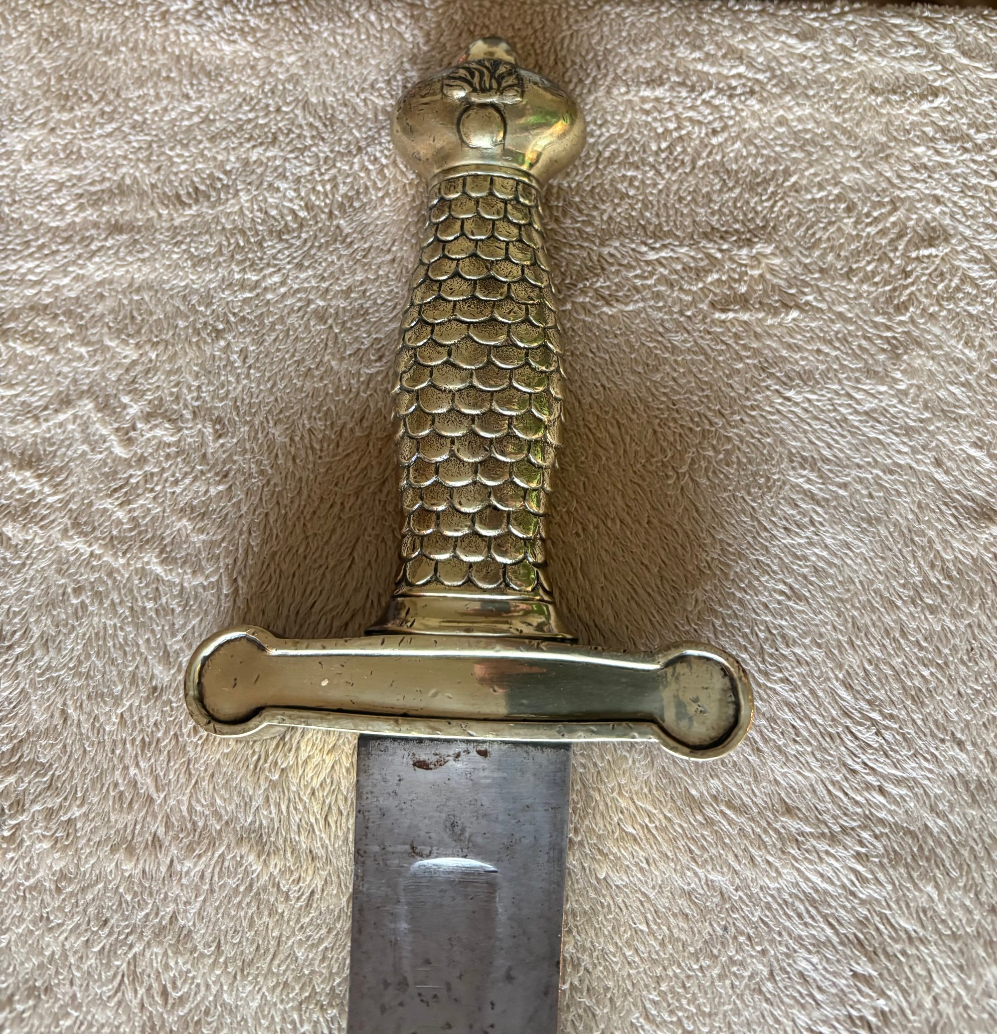 This is a classic 19th Century French model 1816 Foot Artillery Short Sword. It features a heavy solid brass hilt with a distinctive "fish-scale" patterned grip with a wide, straight, and double-edged blade w/central fullers (grooves), modeled after the ancient Roman gladius. . They were primarily used for defense by artillery units during the 19th century but doubled has a practical "tool" for clearing brush to set up gun positions, earning them the French nickname coupe-choux or "cabbage cutter.