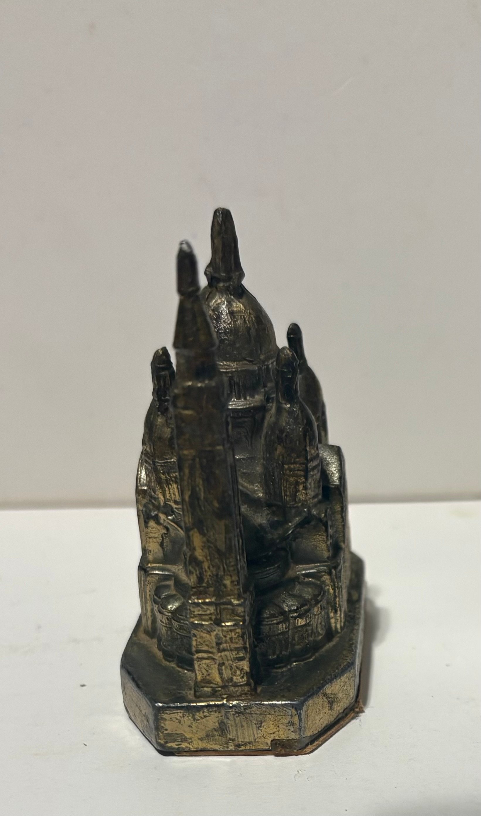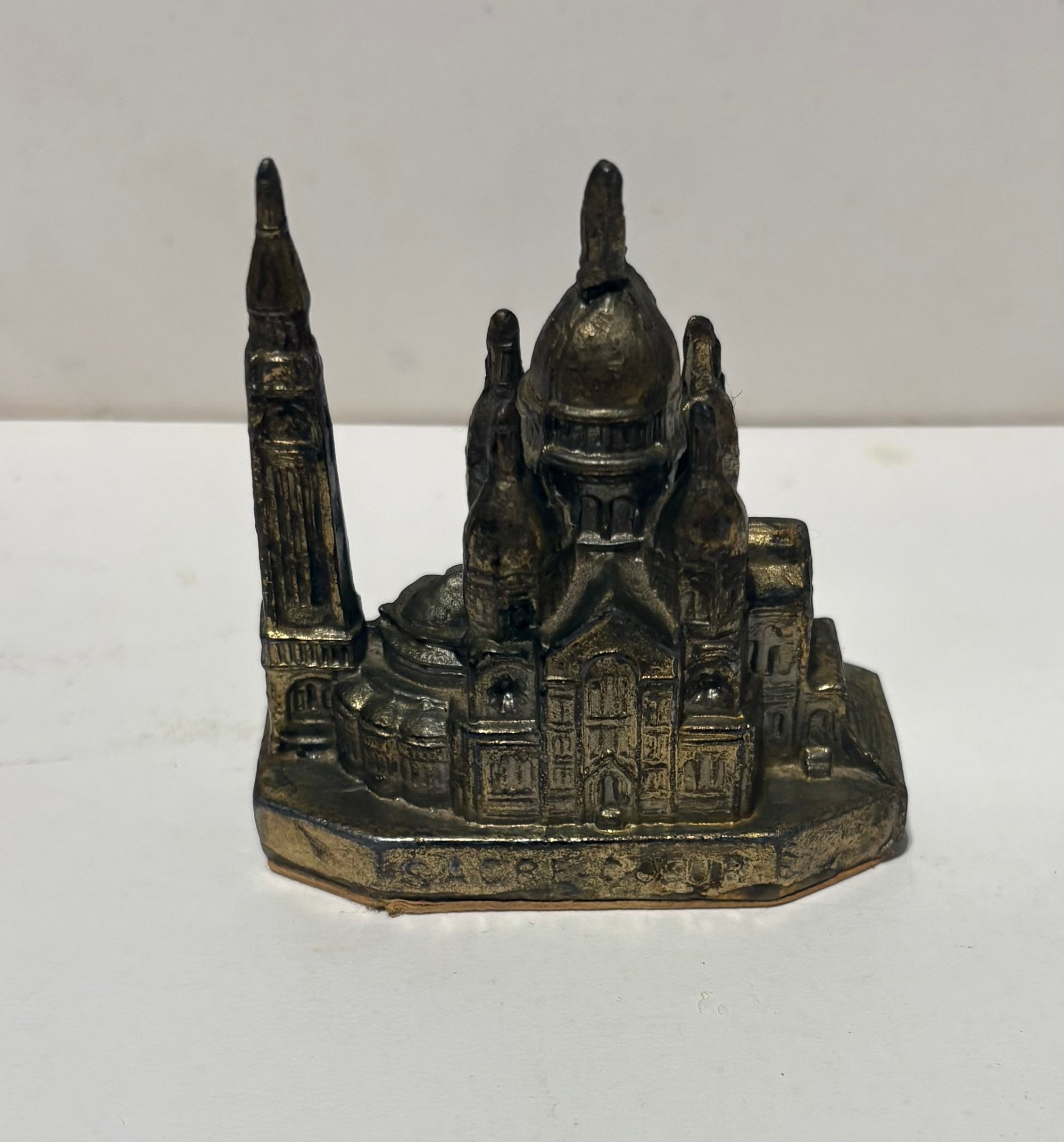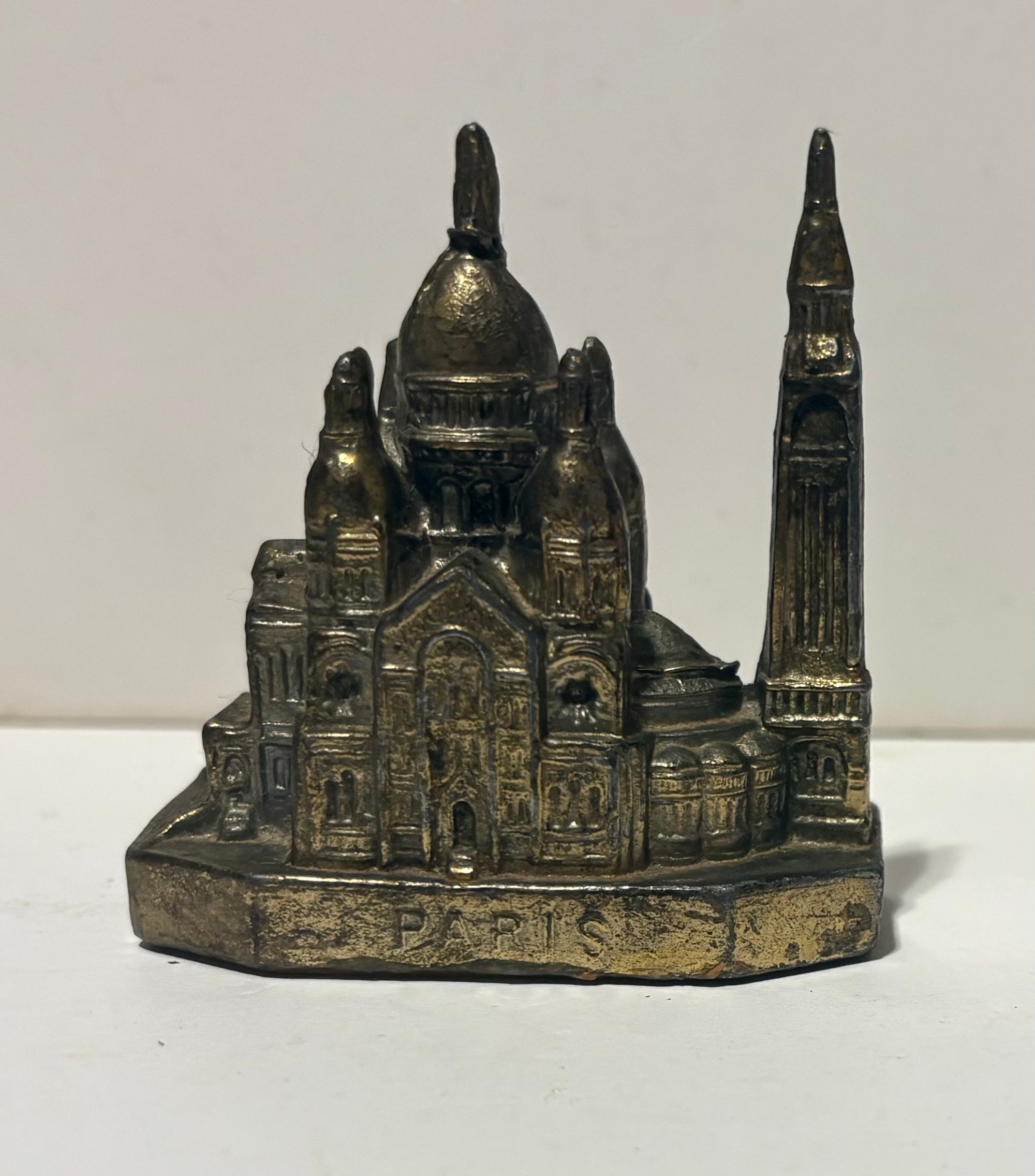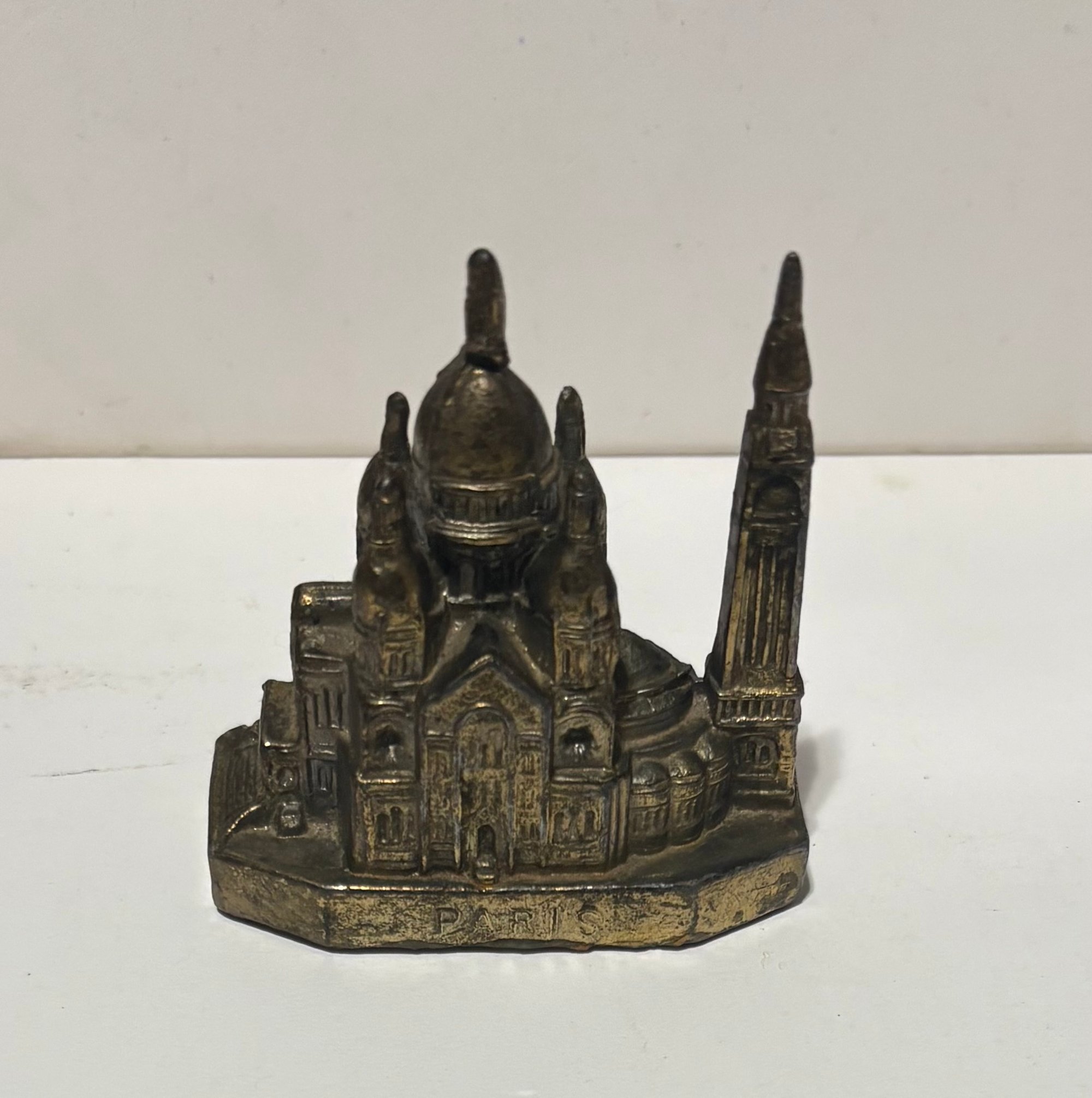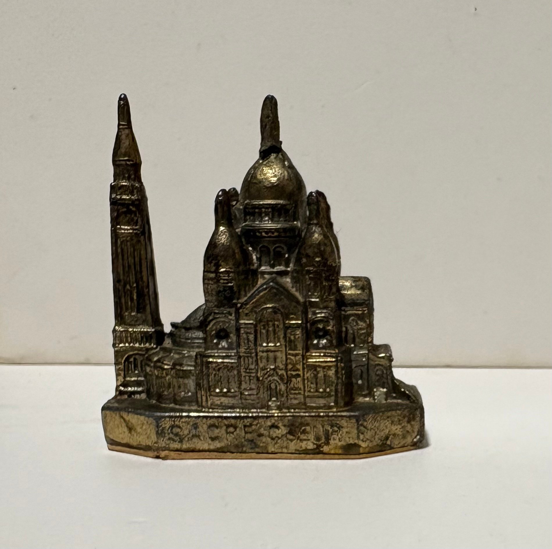 This is a vintage miniature souvenir of a prominent Paris landmark, the Sacré-Coeur Basilica. It’s known for its white travertine facade and large dome. This souvenir is a small-scale representation of the actual Roman-Byzantine style church located at the highest point of Montmartre hill in northern France.
