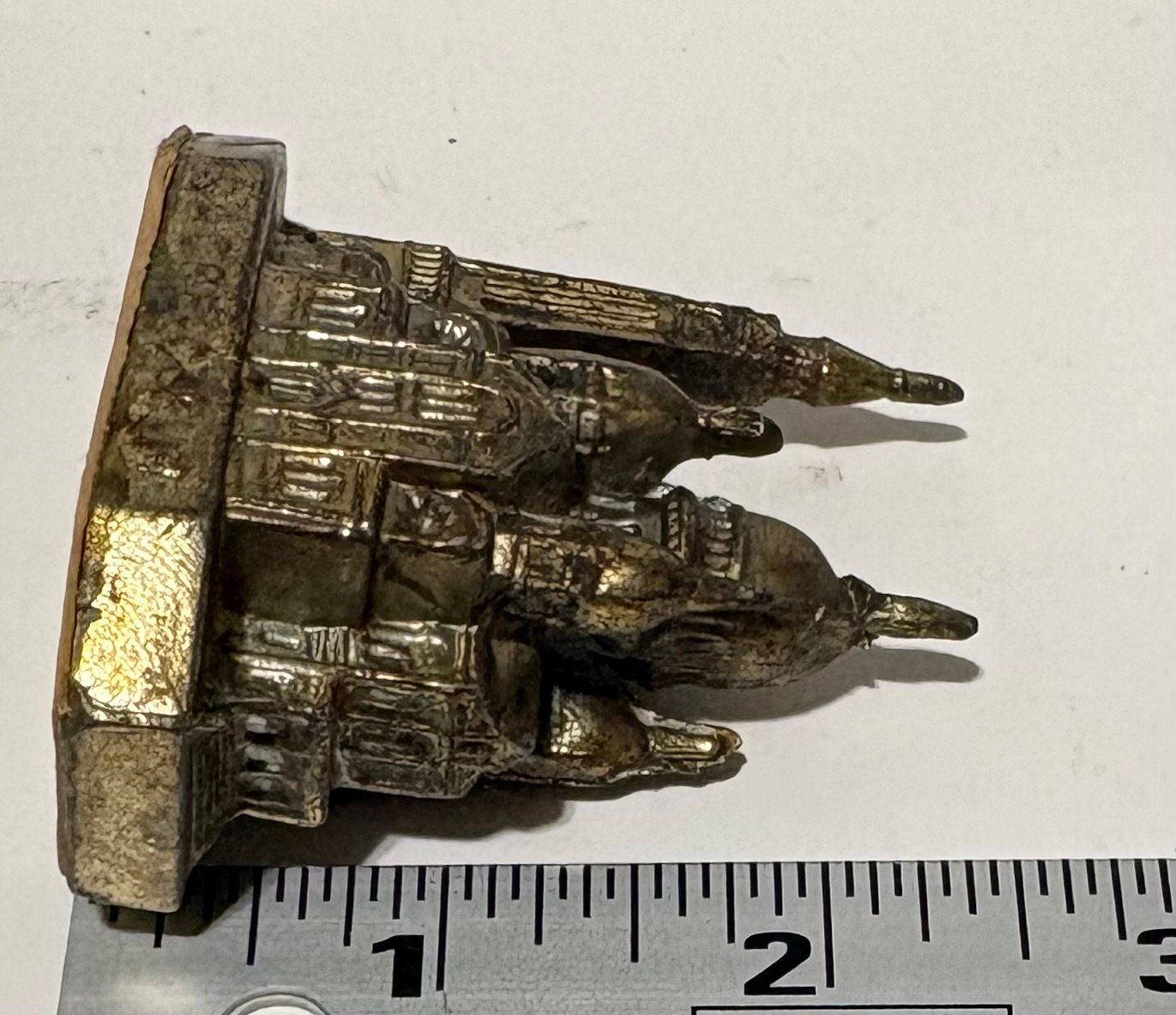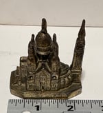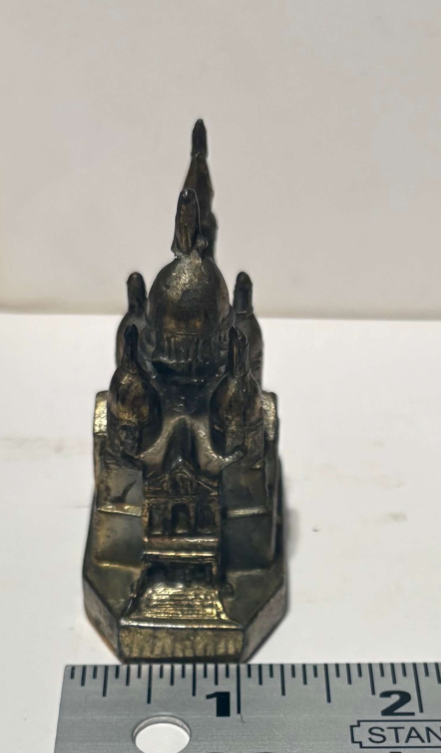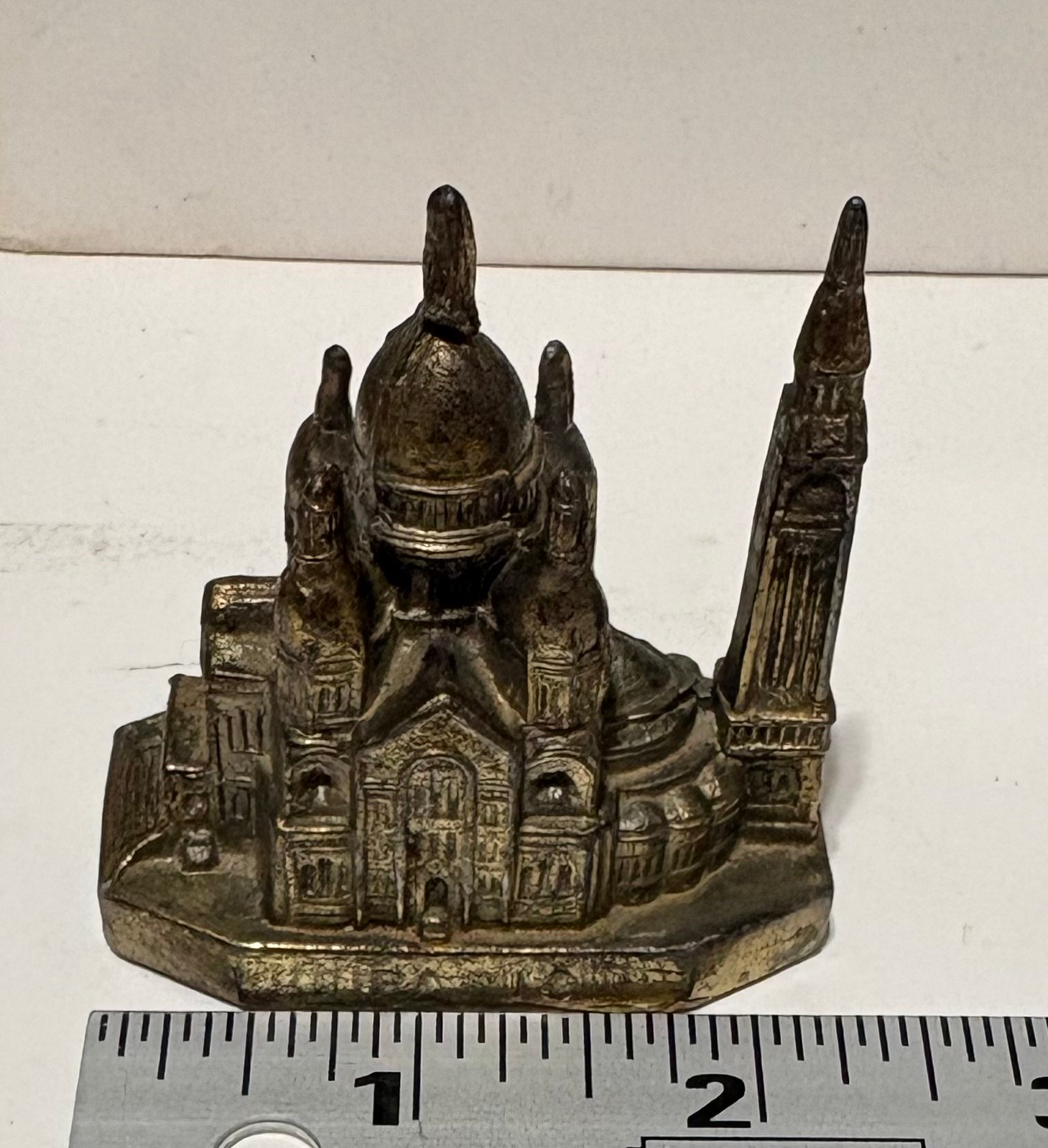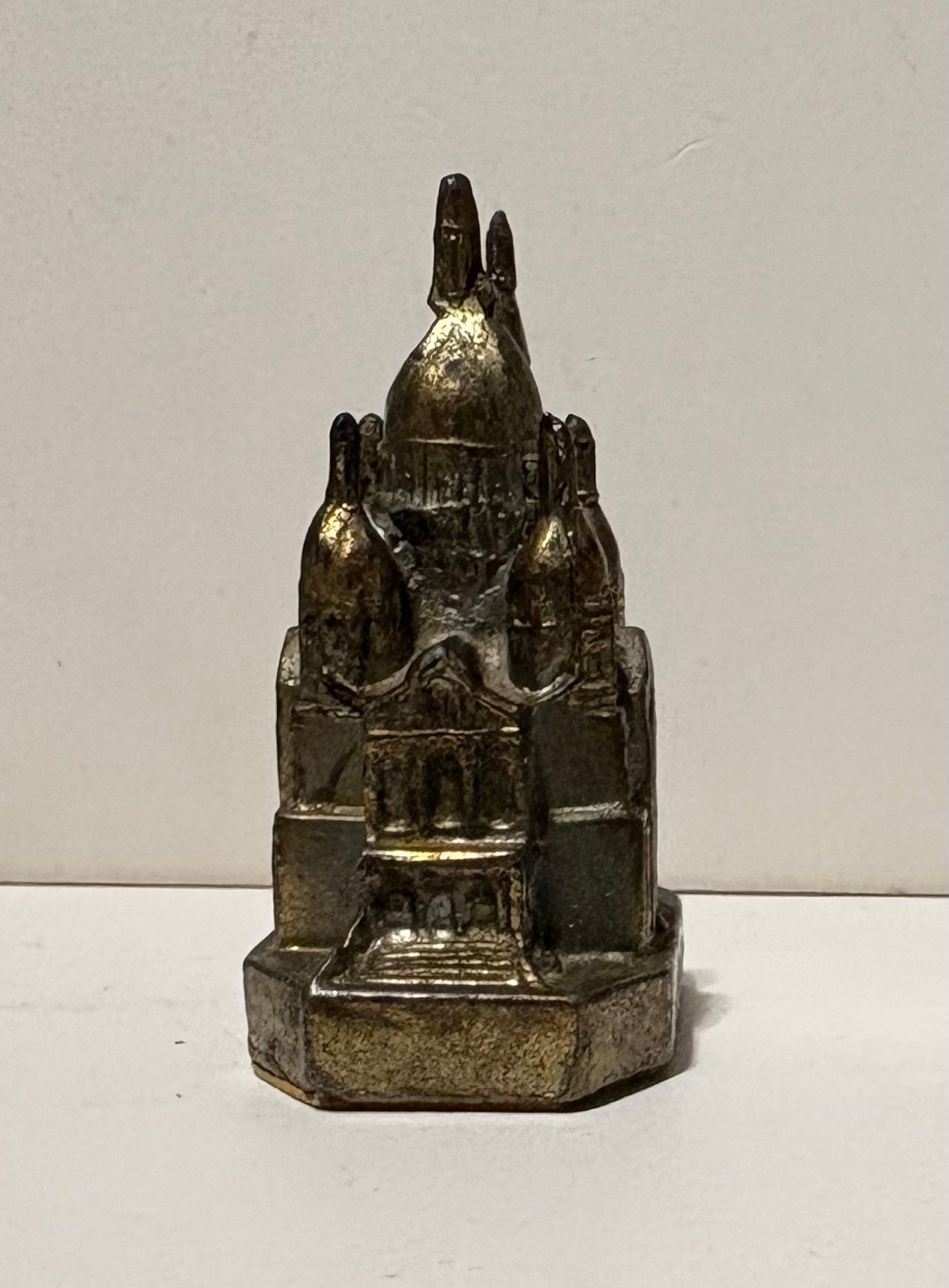 This is a vintage miniature souvenir of a prominent Paris landmark, the Sacré-Coeur Basilica. It’s known for its white travertine facade and large dome. This souvenir is a small-scale representation of the actual Roman-Byzantine style church located at the highest point of Montmartre hill in northern France.