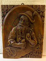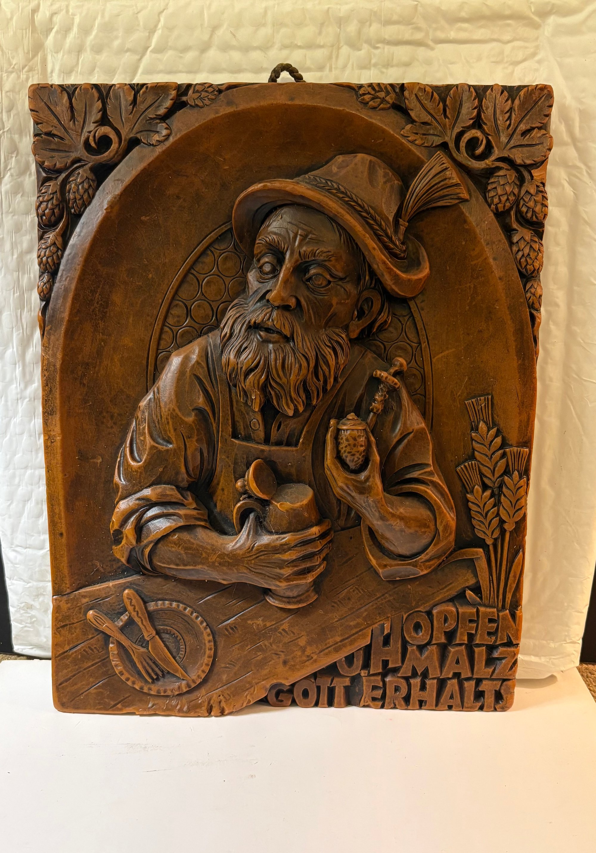 Authentic German hand-carved wax relief decorative wall plaque. It features a traditional German saying related to beer brewing.