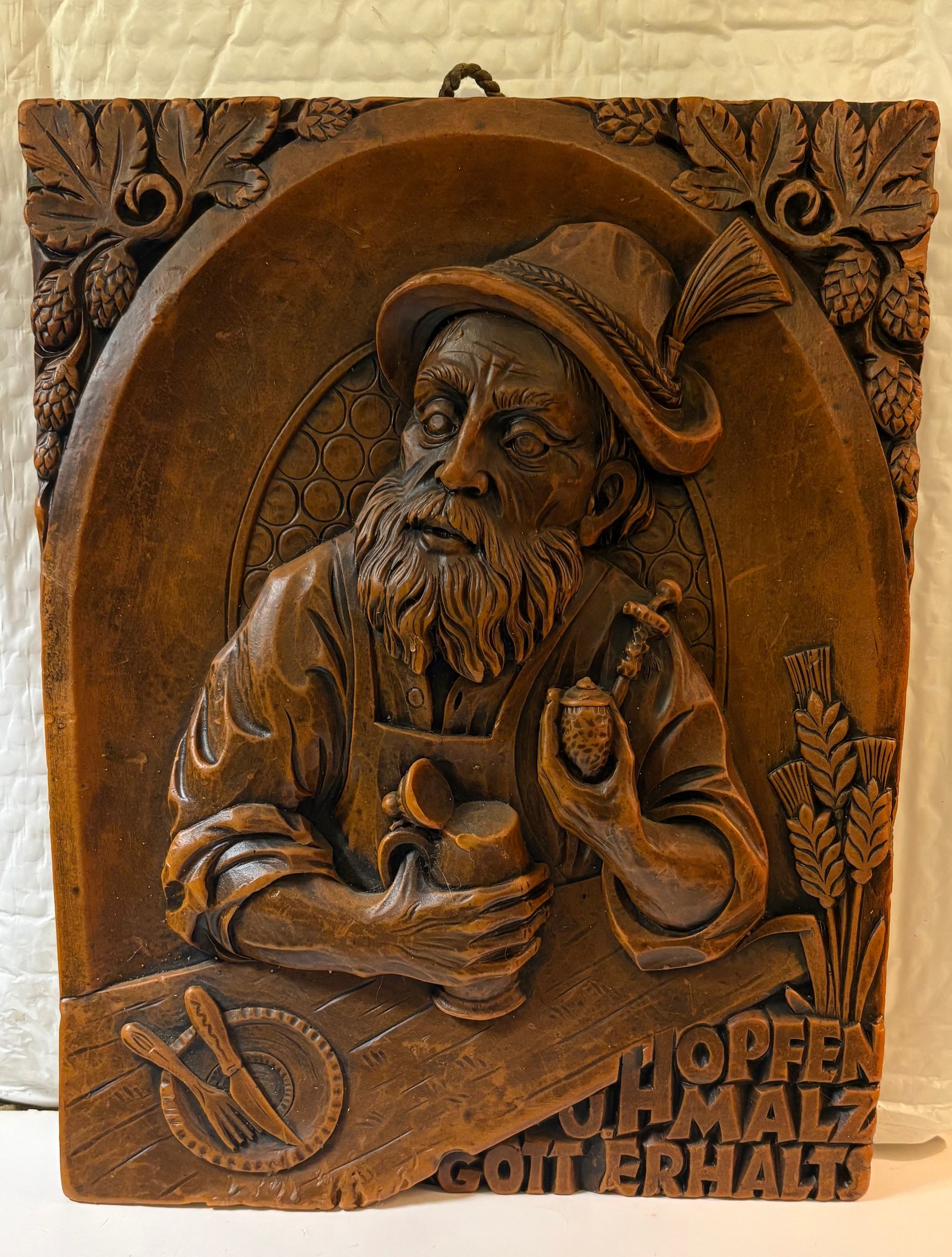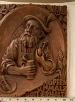 It’s a wax relief sculpture, depicting a German man in traditional fest attire holding a beer stein and a hop cone. It features decorative borders of hops and wheat/barley.