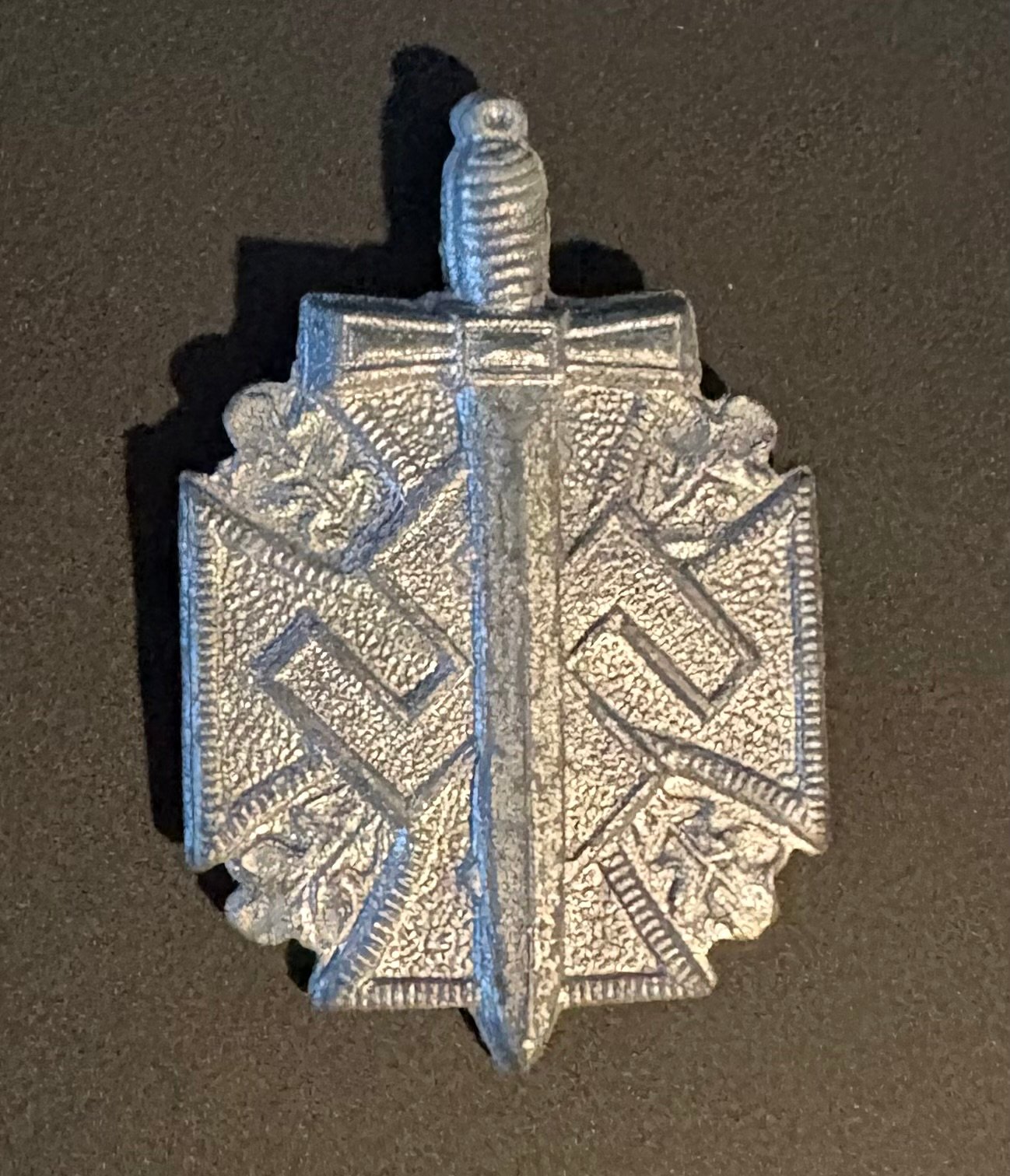 Features a sword prominently displayed over stylized swastika that represents military veterans or Armed Forces Day. Constructed from a lightweight alloy. The reverse is missing the pin-back device but is otherwise in excellent condition.