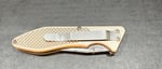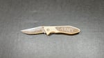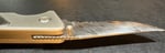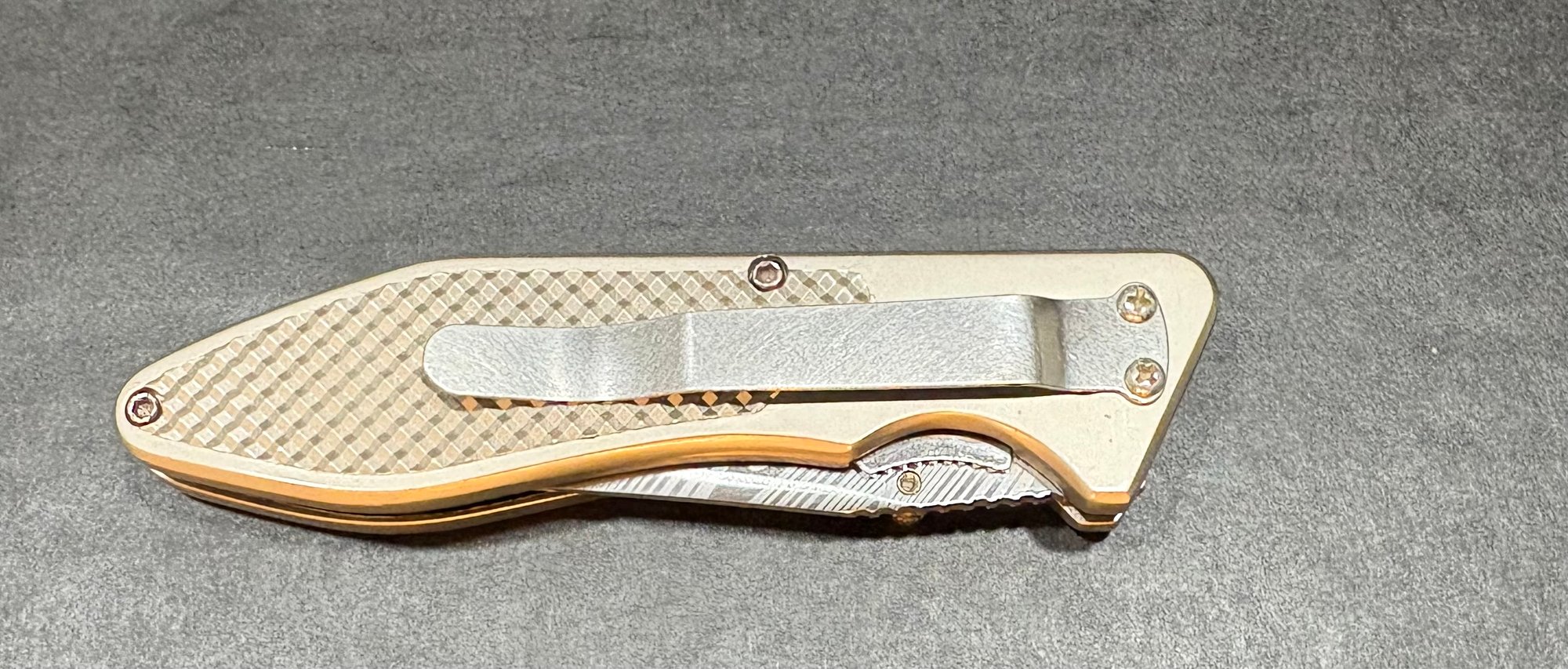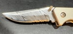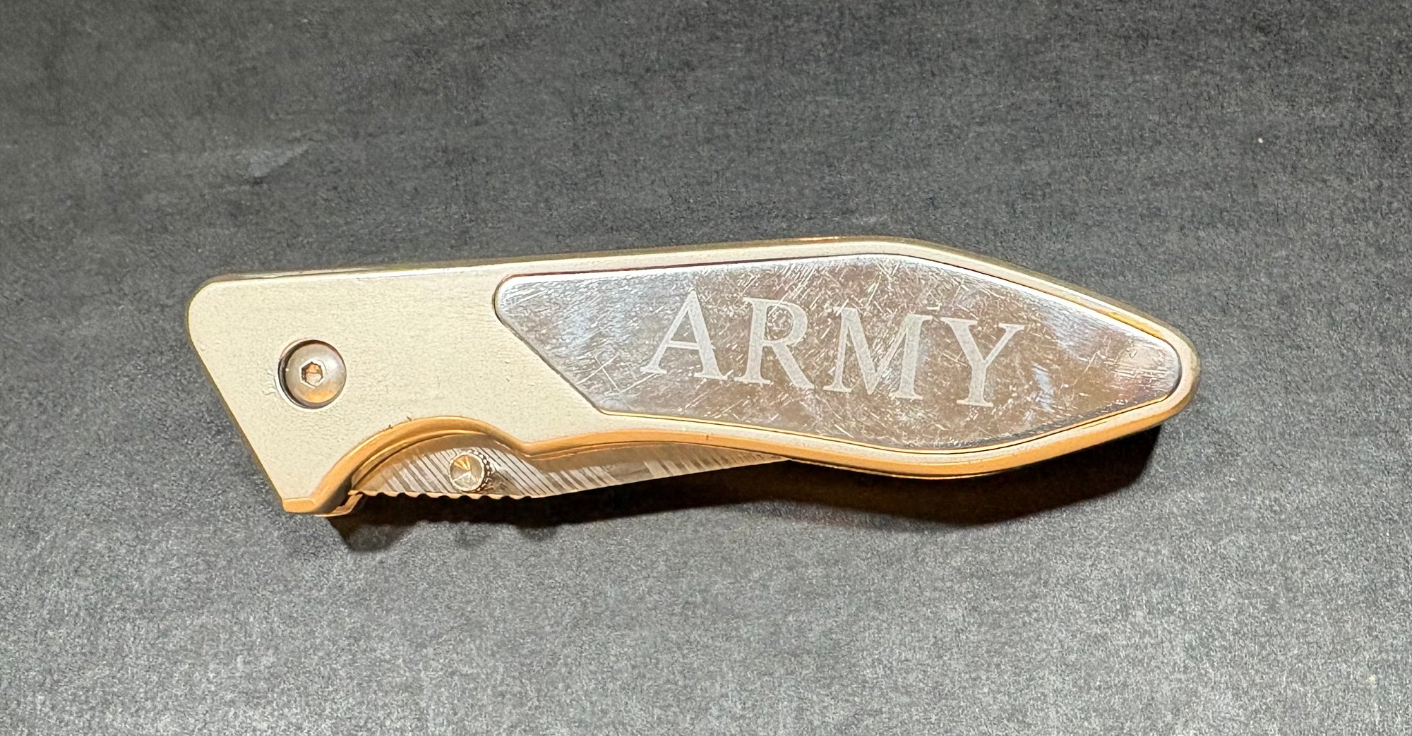 This is a custom made Damascus folding pocket knife with a liner lock where a metal bar inside the handle secures the blade in the open position.. The blade is crafted from Damascus steel, recognizable by its unique, wavy "water-like" surface pattern. It has a partially serrated edge near the handle and a thumb stud for easy opening. The handle features a decorative inlay with the word "ARMY" engraved on it.