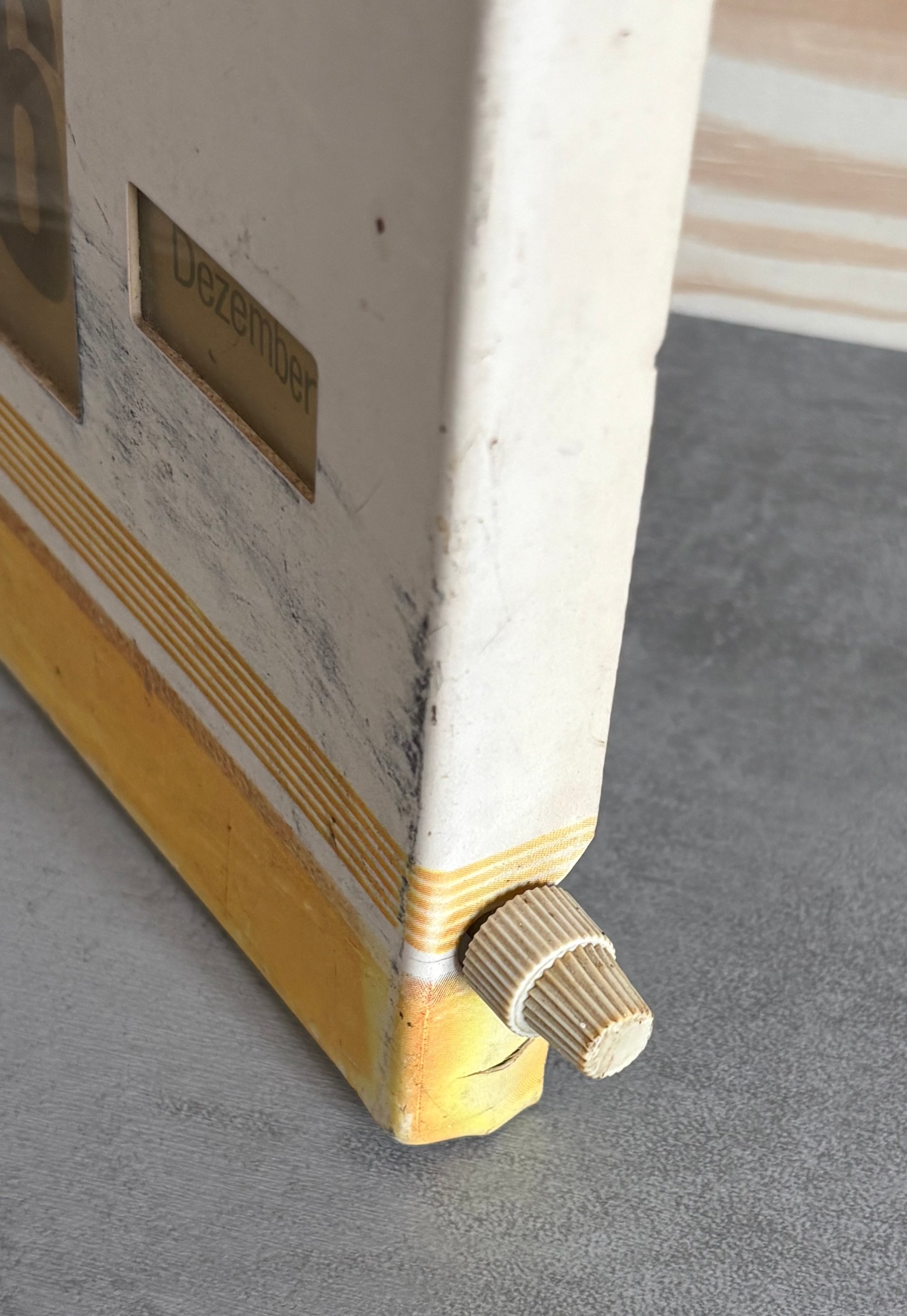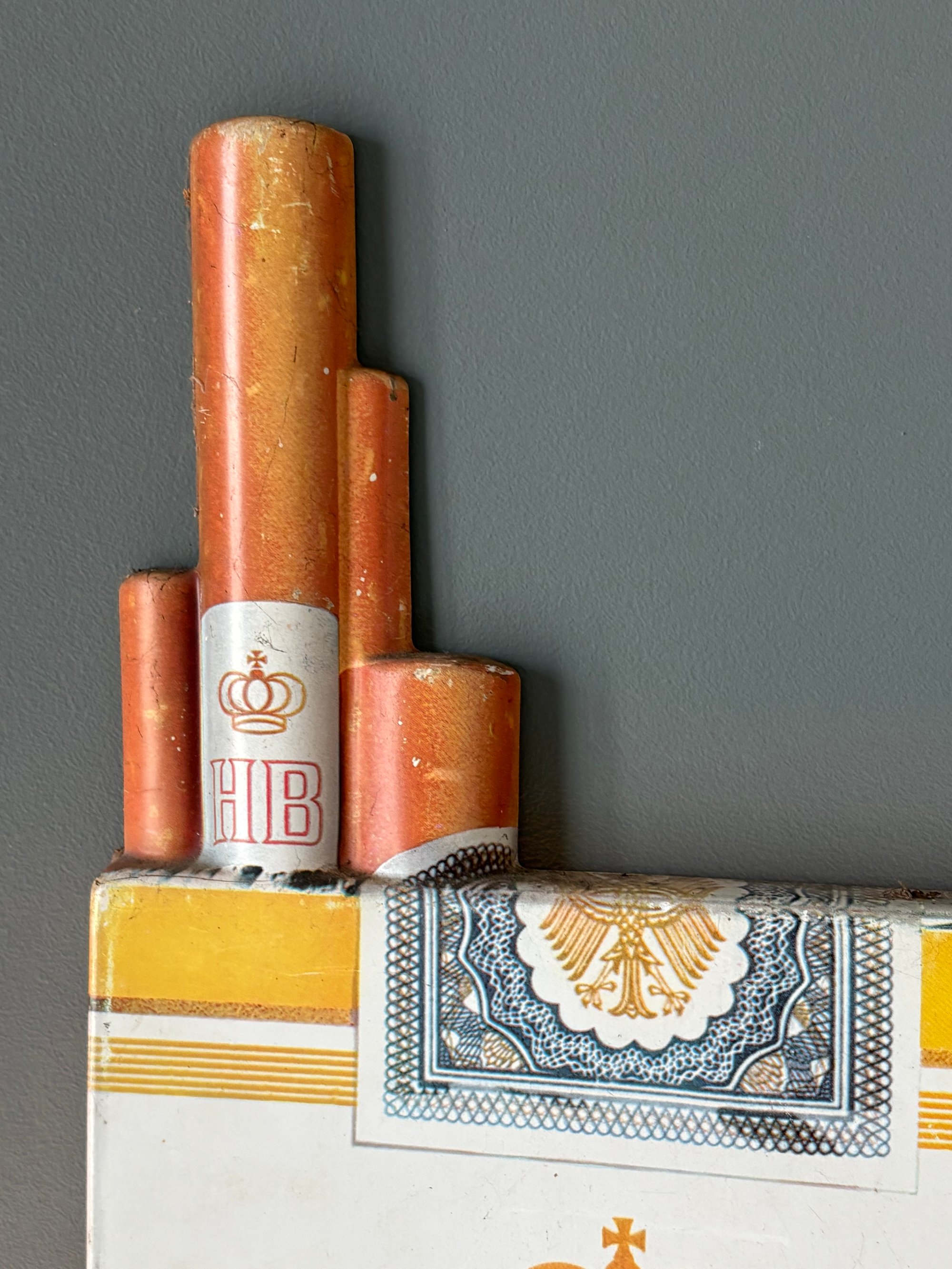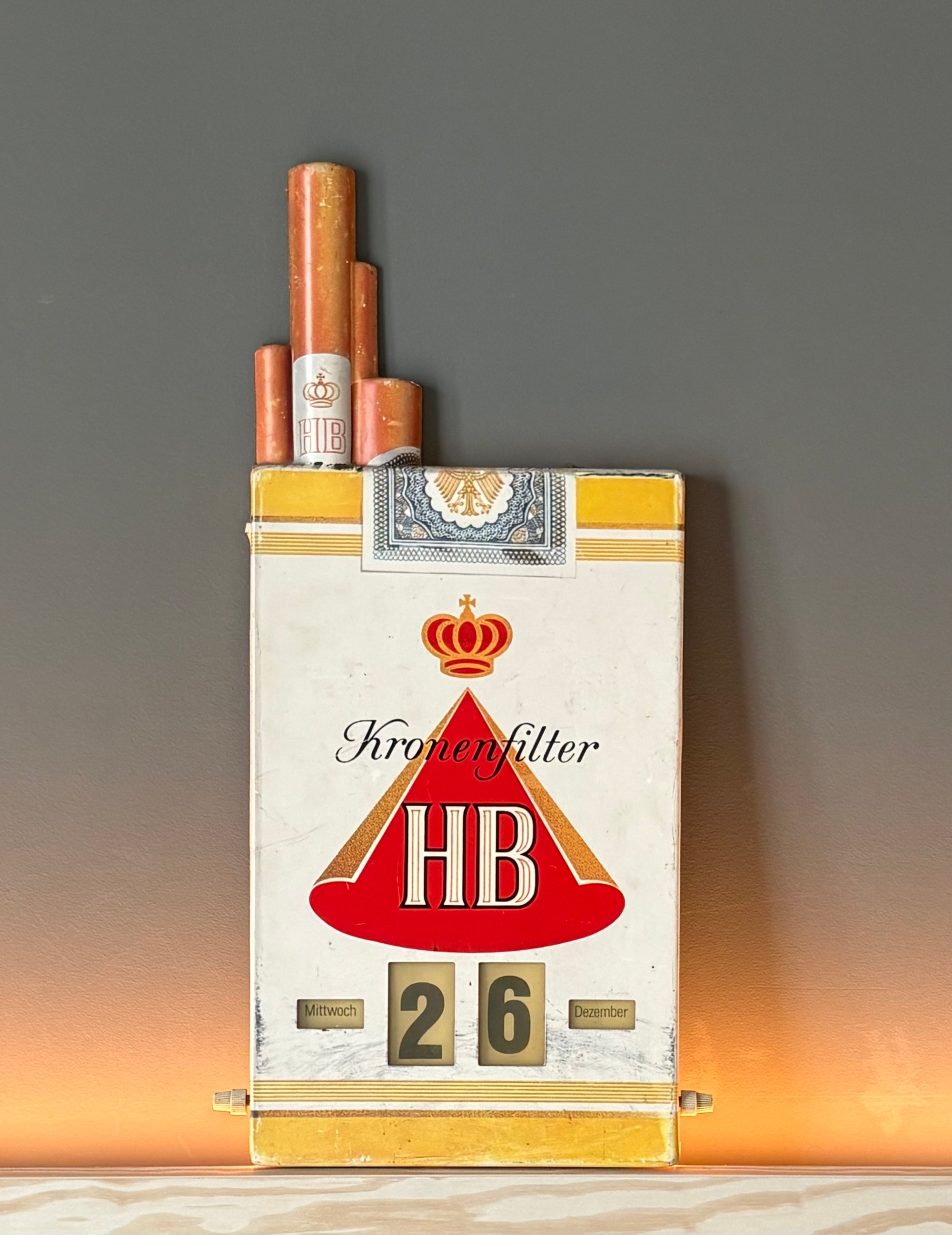 It’s made of plastic & very lightweight. It is designed to resemble a pack of HB cigarettes, complete with the iconic red triangle logo and crown. All the dials (4 of them) are operational and functional. The reverse has a hole for ease in hanging and contains the maker mark (Fritz Borsi KG out of Offenburg) and indicates it's production in West Germany with the official government trademark, patent, & design protection stamp. The sign is plastic so will have presentation marks; standard age wear consistent with its age should be expected. Please review photos carefully.