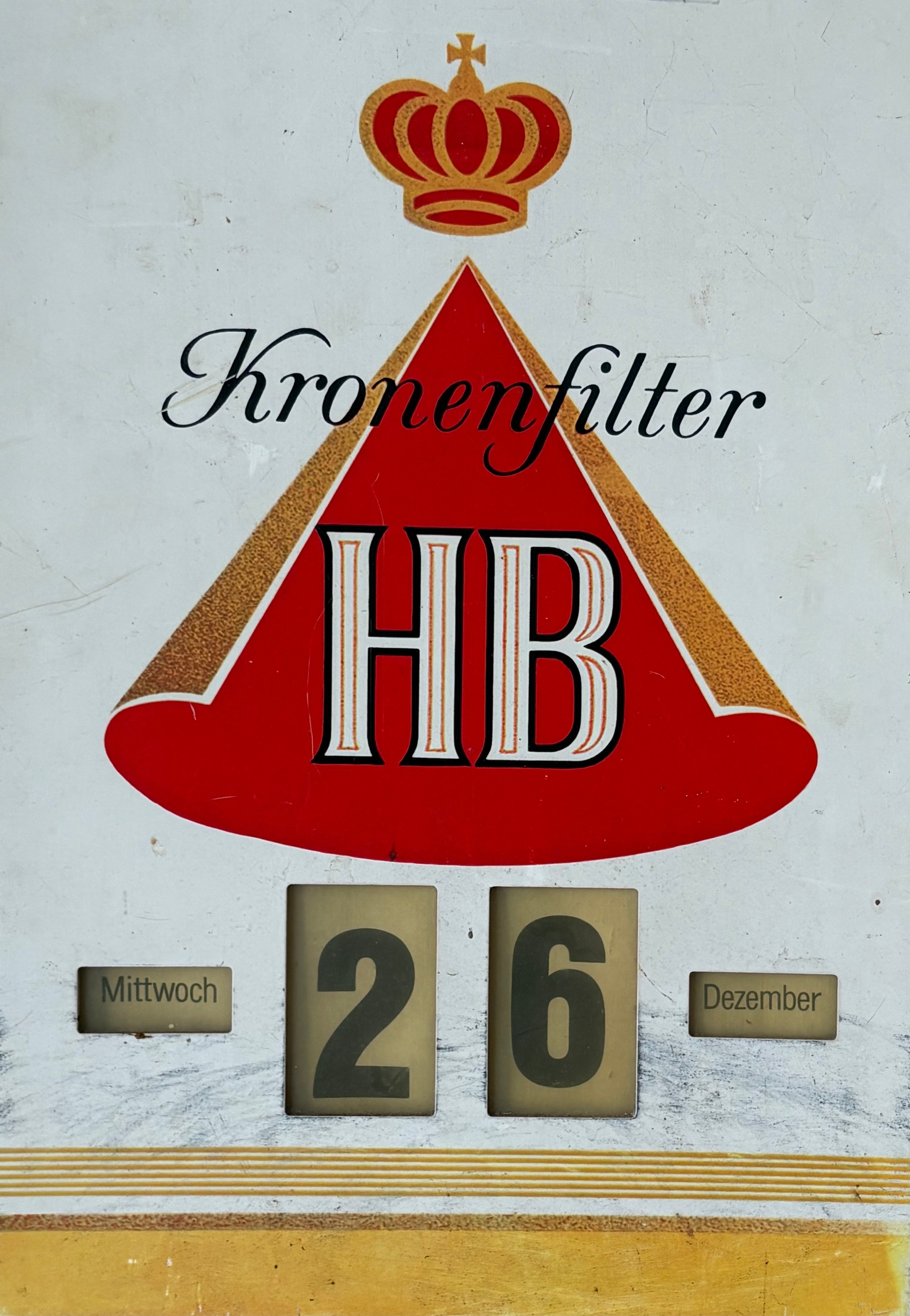 This is an authentic West Germany HB Kronenfilter Dauerkalender (perpetual calendar), a classic piece of promotional merchandise for the German cigarette brand HB (Haus Bergmann). It's a manual rotary calendar ("Drehkalender") used to display the day of the week, numerical date, and month.