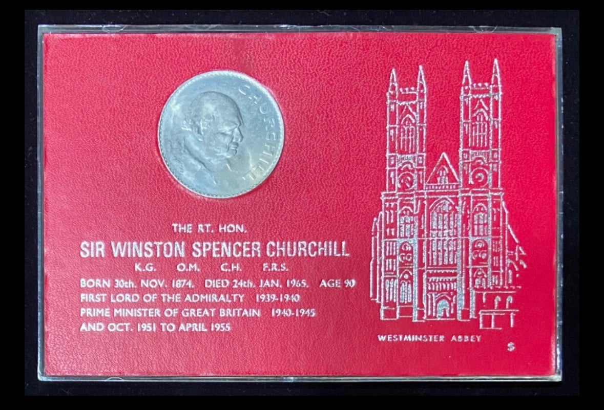 This is an authentic 1965 Sir Winston Churchill Commemorative Crown (Coin), presented in a red memorial card holder featuring an illustration of York Minster. This was a first time a non-monarch was portrayed on a British coin.
