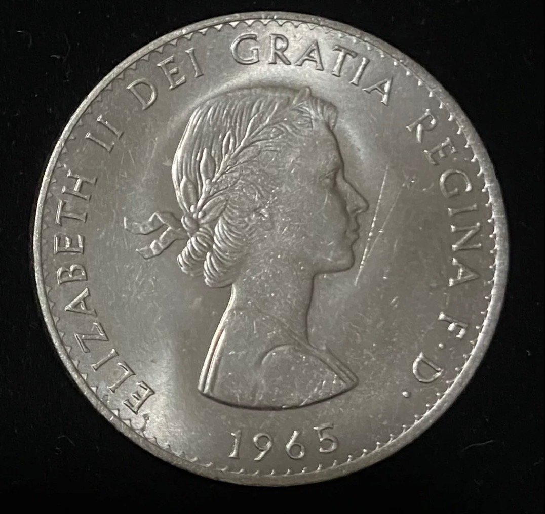 This is a British Pre-decimal currency with a face value of 5 Shillings (One Crown) and is made of Copper-Nickel. It was issued by the Royal Mint to mark the death of Sir Winston Churchill (1874-1965) & circulated during the Elizabeth II era (1965 to ca. 1971).