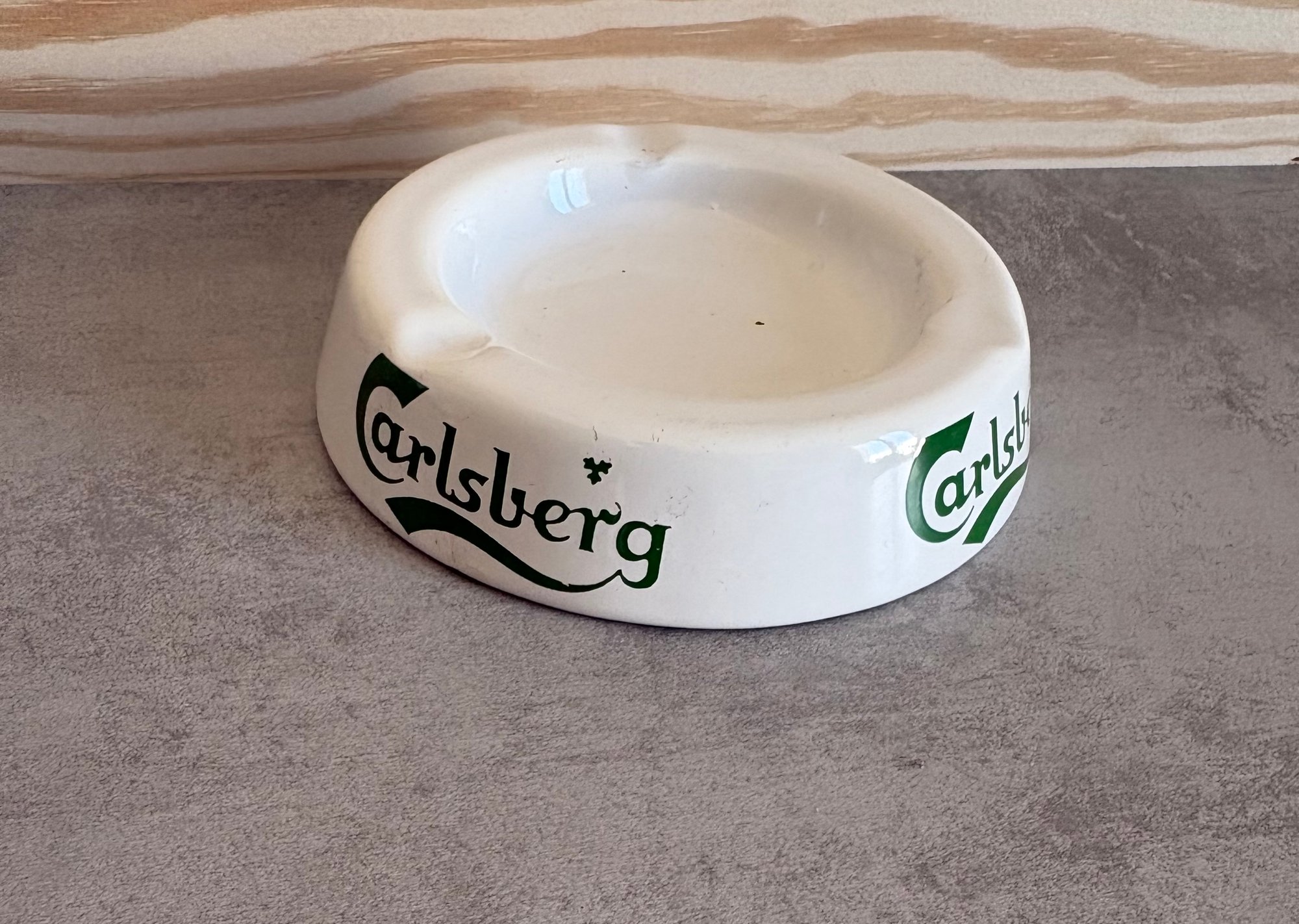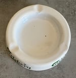 Enamel ashtray featuring the classic green Carlsberg logo on a white background & three cigarette rests. Lightweight & durable ashtray perfect for the 90s bistro/pub environment and onto contemporary use. The ashtray is in good condition w/some minor age wear.