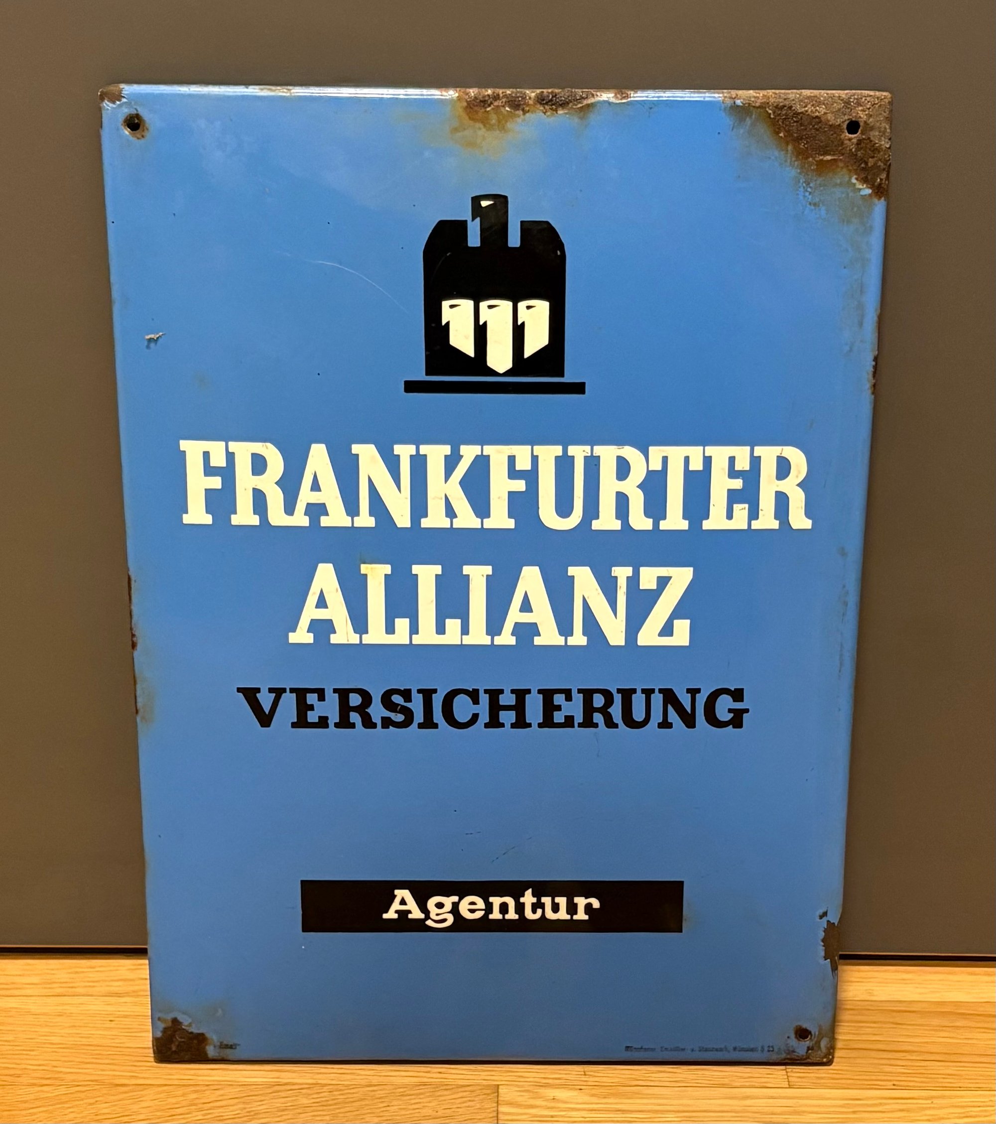 This is an authentic vintage German enamel sign for the Allianz Insurance Company, specifically the local agency in Frankfurt, Germany.