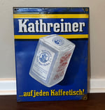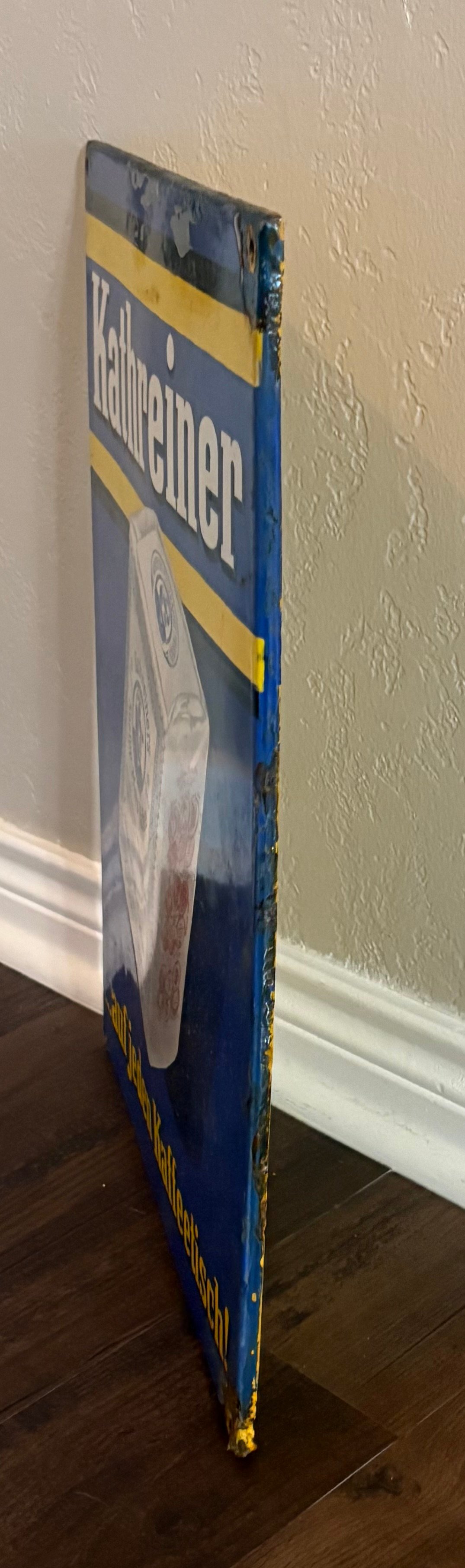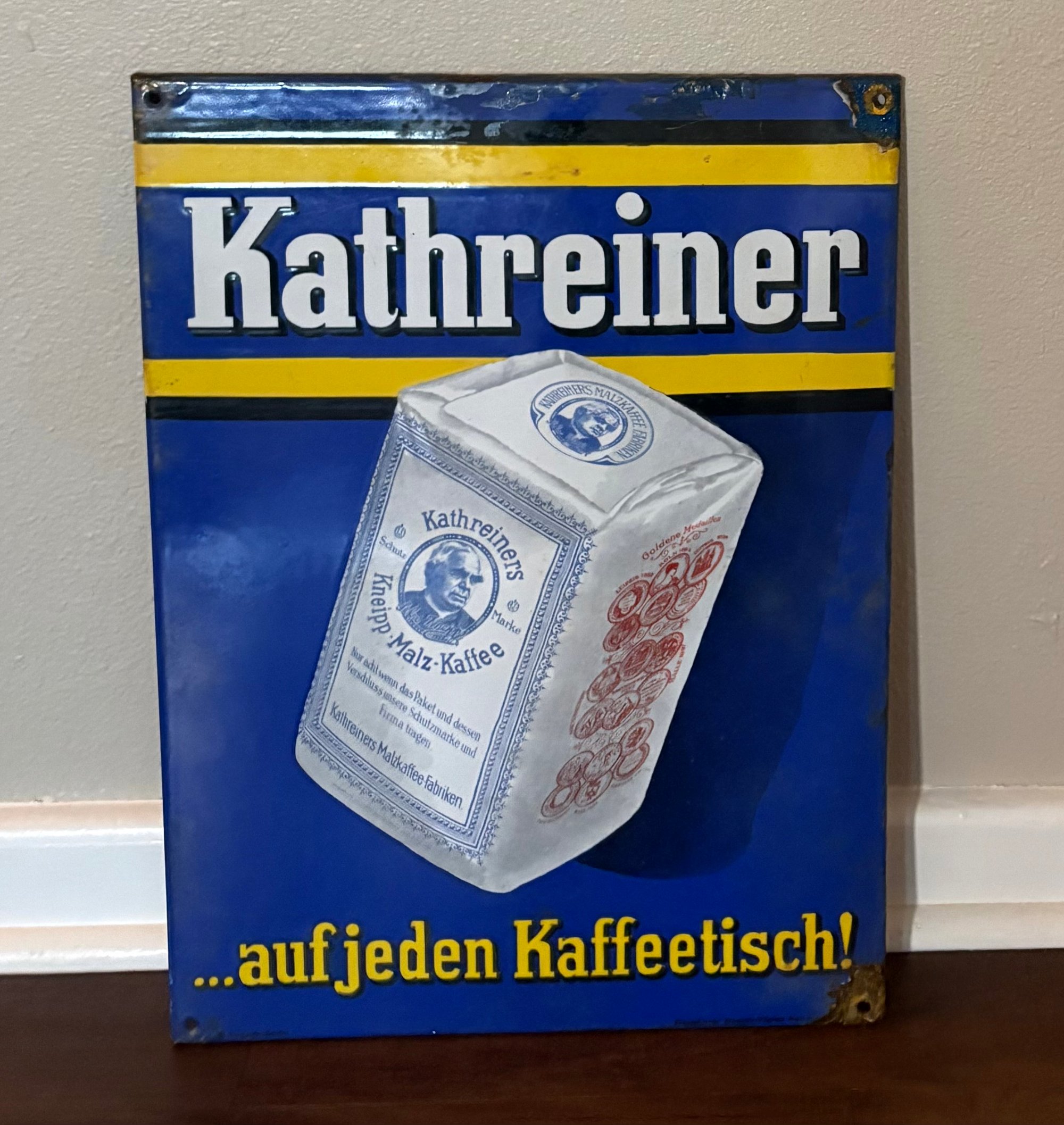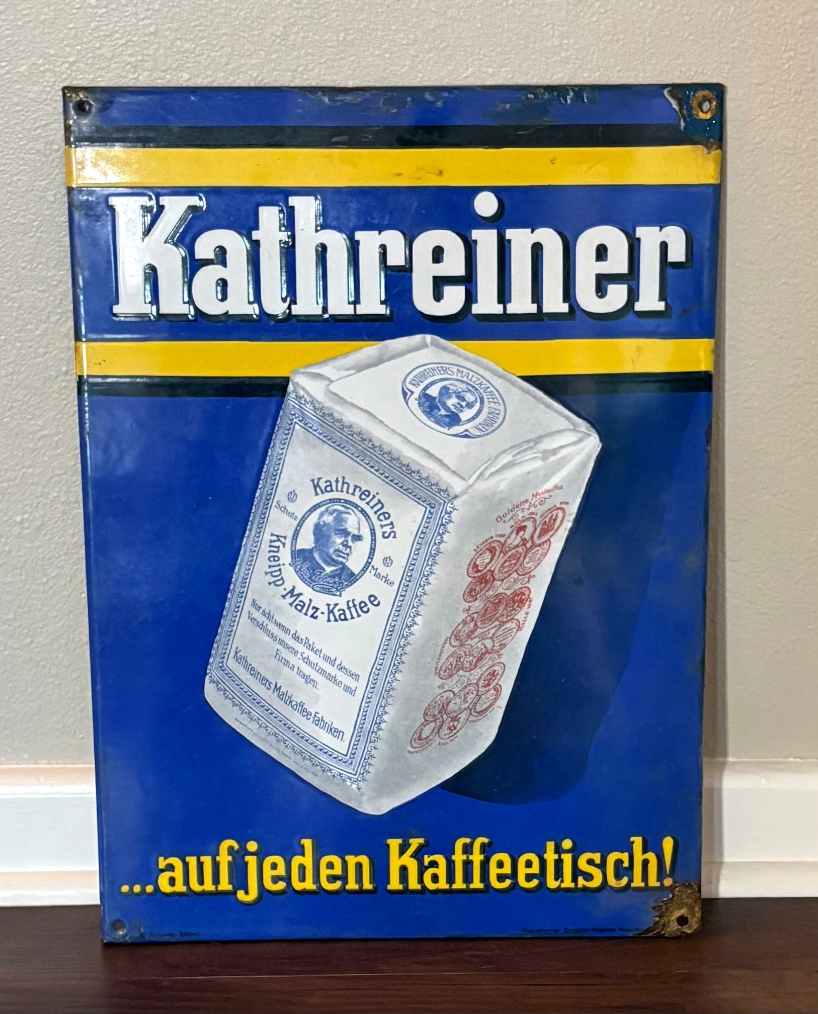 This is an authentic antique German enamel advertising sign for Kathreiner Malz-Kaffee, which is a German malt coffee substitute brand. Kathreiner is a German company founded in 1829 that specialized in groceries and was well known for its malt coffee substitute.