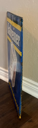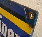 It's a flat sign w/rounded edges and has a solid covering of enamel (save for a few areas of wear). It’s a solid, heavyweight piece with a few enamel vacancies, particularly in the normal locations...the corners - indicative of standard age wear consistent with age. Please review photos carefully.