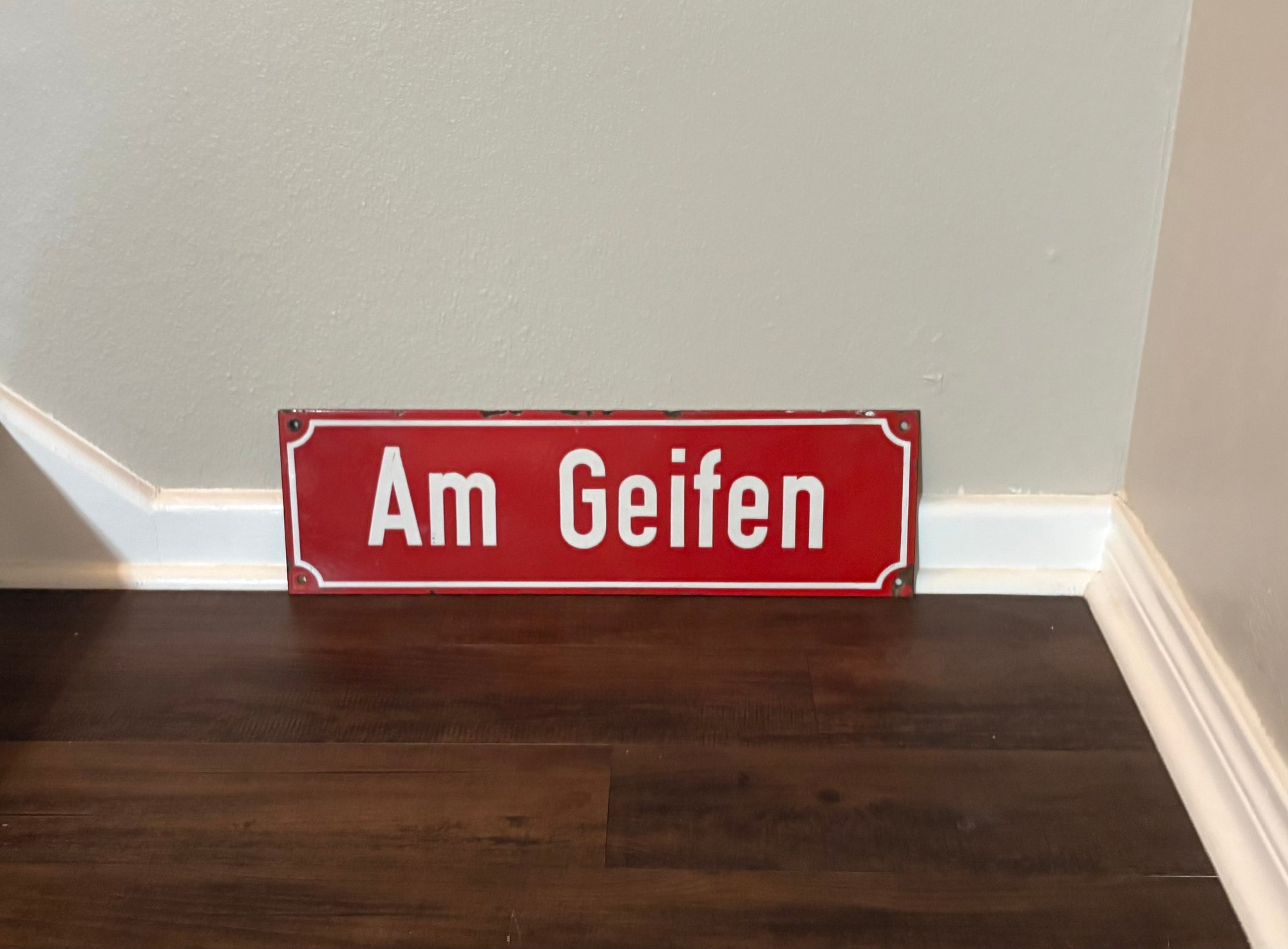 This is an authentic red German enamel street sign - Am Geifen (At Geifen). The street is located in the Mombach district of Mainz, Germany, the capital city of Rhineland-Palatinate. The sign carries the name "Am Geifen" and is listed as an official street name in the city's directories.