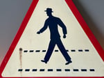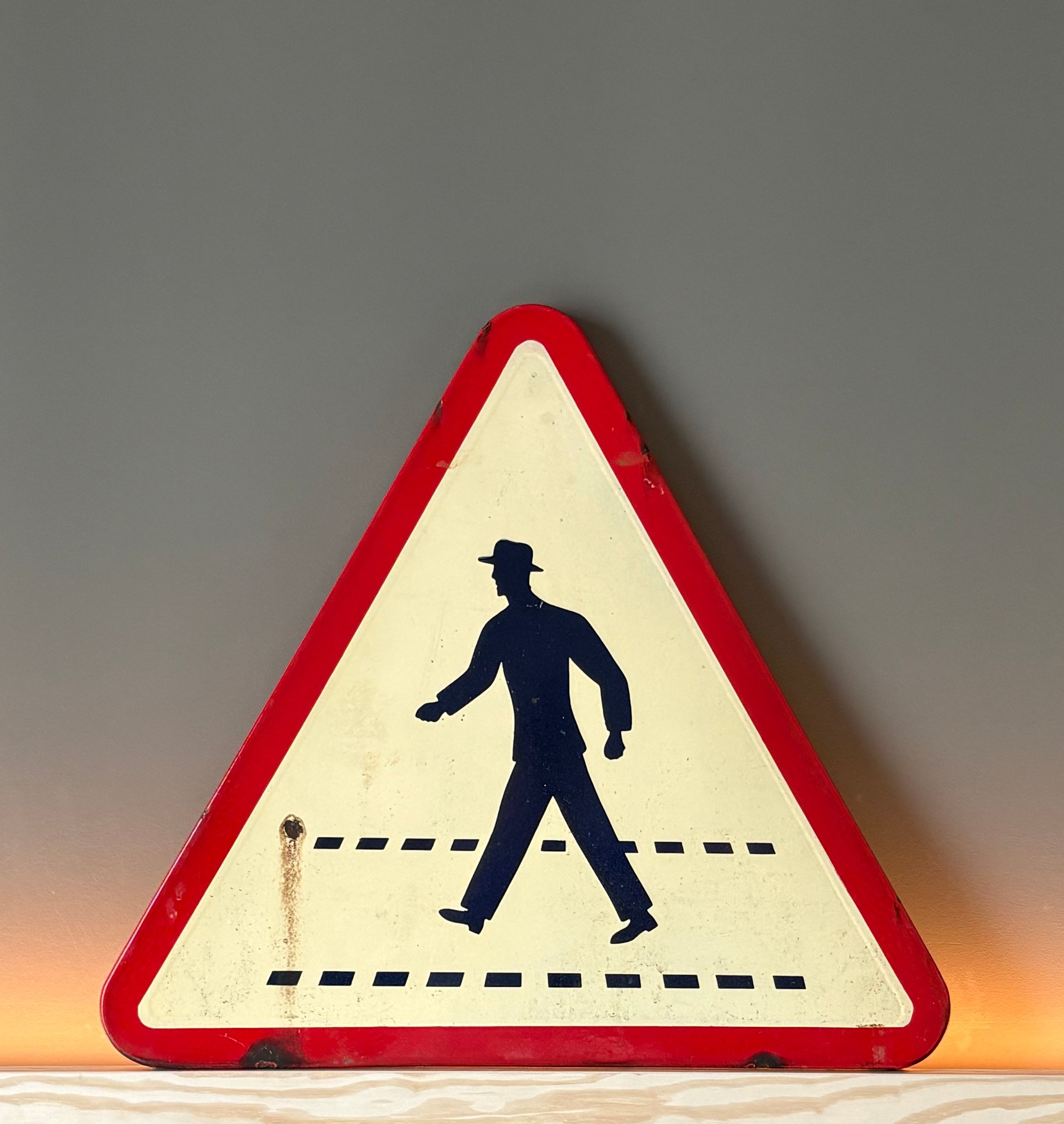 This specific "hat man" design was part of the German StVO 1956 regulations and remained in production through the 1970s. Manufacturer stamp at reverse indicates production in 1972; sourced directly from the region of Rhineland-Palatinate, Germany.