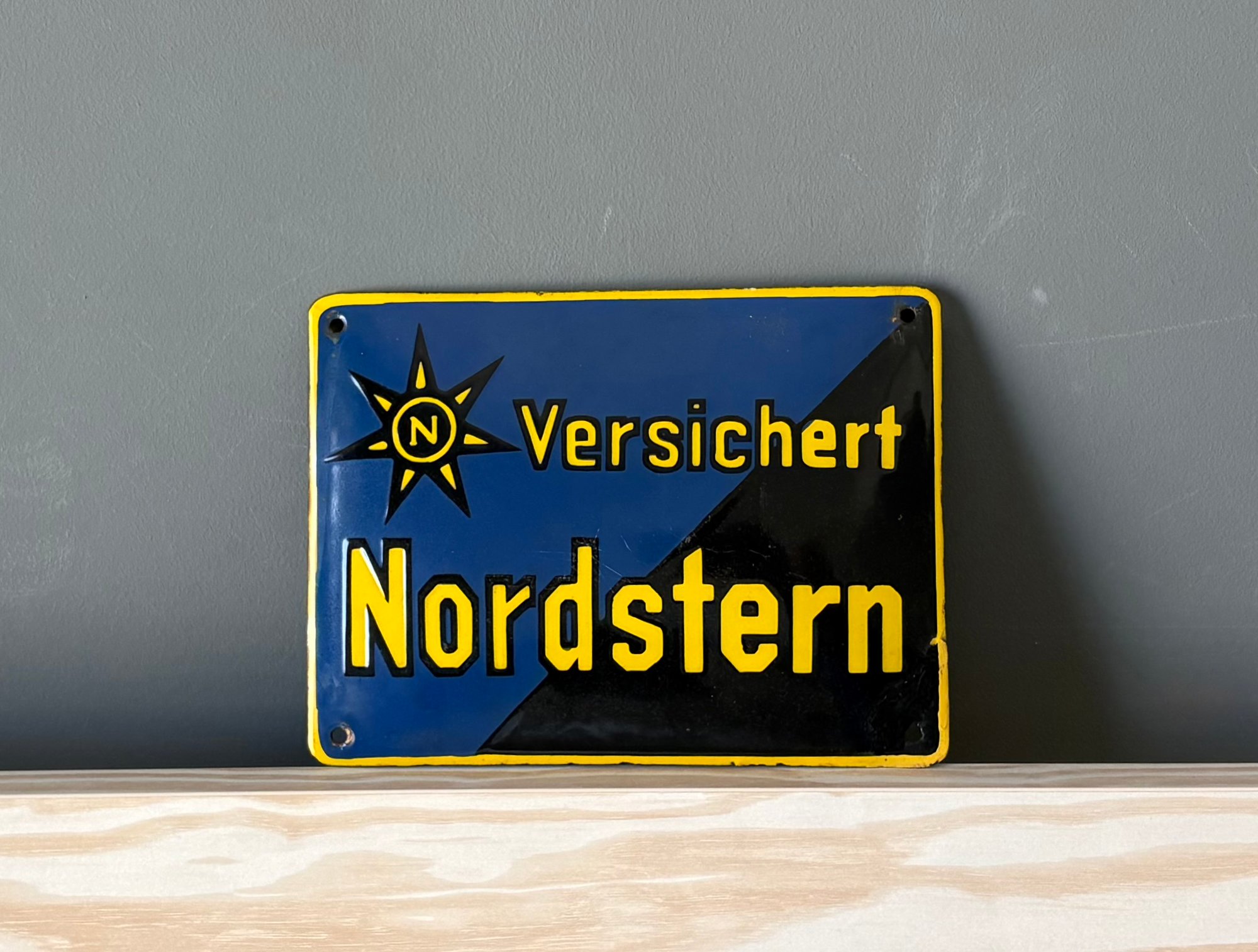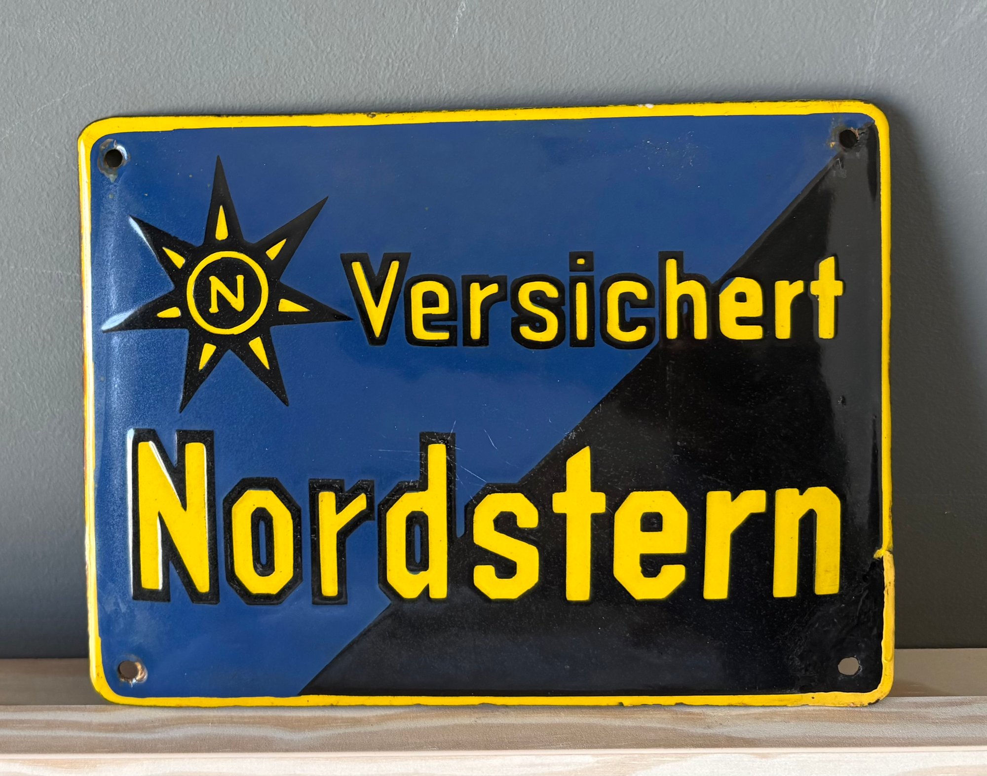 This is an authentic vintage German enamel Insurance sign for the Nordstern insurance company. Nordstern is a major German insurance group w/roots back to 1857. The sign features the phrase "Versichert" which means "insured". These signs would have been displayed on buildings of insurance agencies indicating they were insured...by Nordstern.