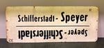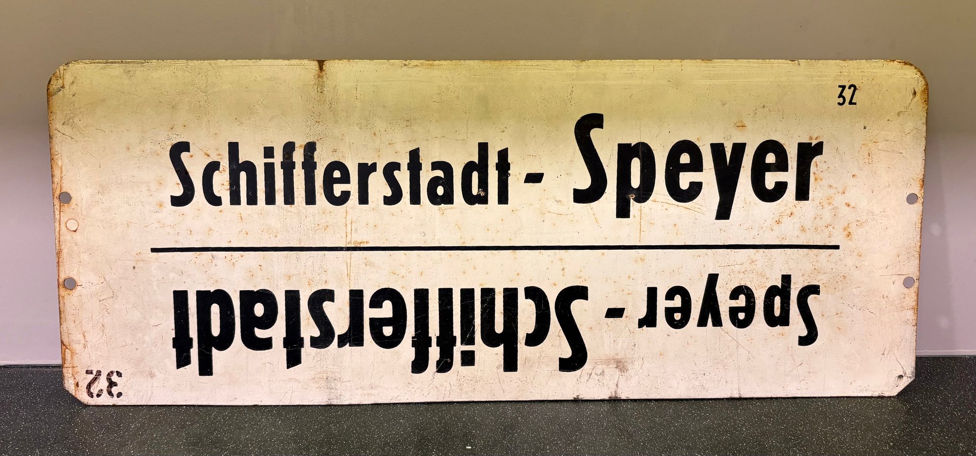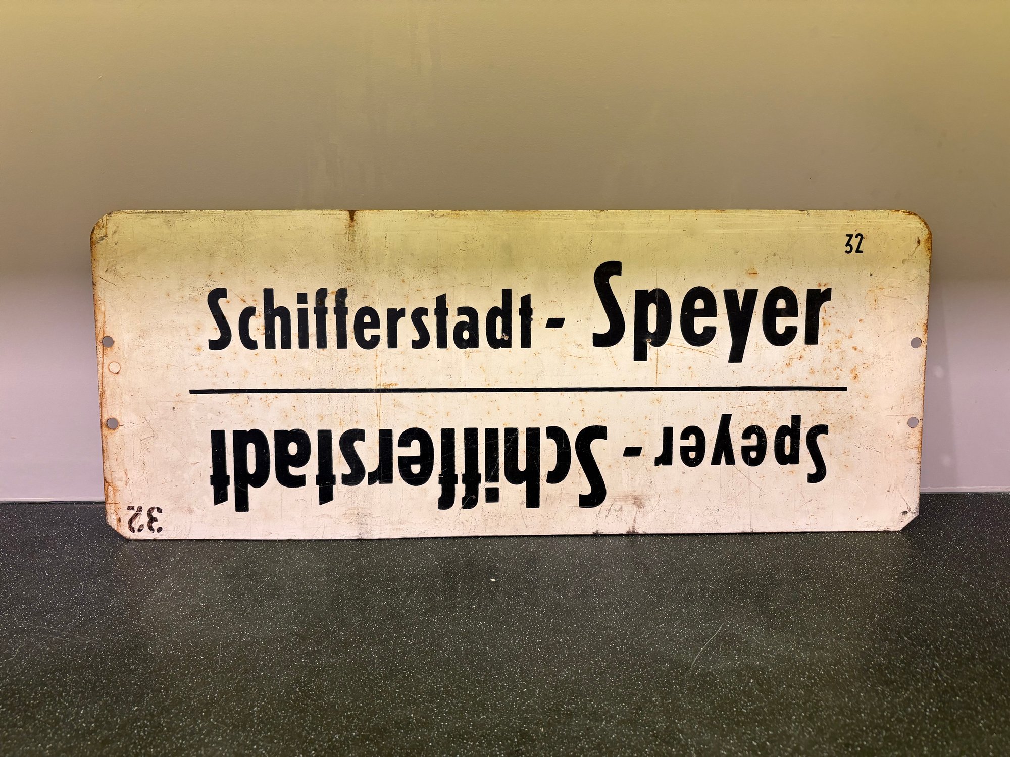 This is an authentic German train destination metal sign. The sign carries the name of the starting location (Schifferstadt) & its end location (Speyer). It can be flipped upside down for when the train returns in the opposite direction.