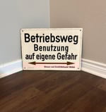 This is an authentic vintage German cast aluminum operational path notice sign. They are historically used to mark service roads along waterways. Signs like this were commonly posted to identify the paths primarily intended for the operation and maintenance of federal waterways (like the Rhine river). While such paths might be open to the public for walking or cycling, the "at your own risk" disclaimer is a standard legal measure to protect the authority from liability in case of accidents, especially since these paths may not have regular winter maintenance or standard safety features.