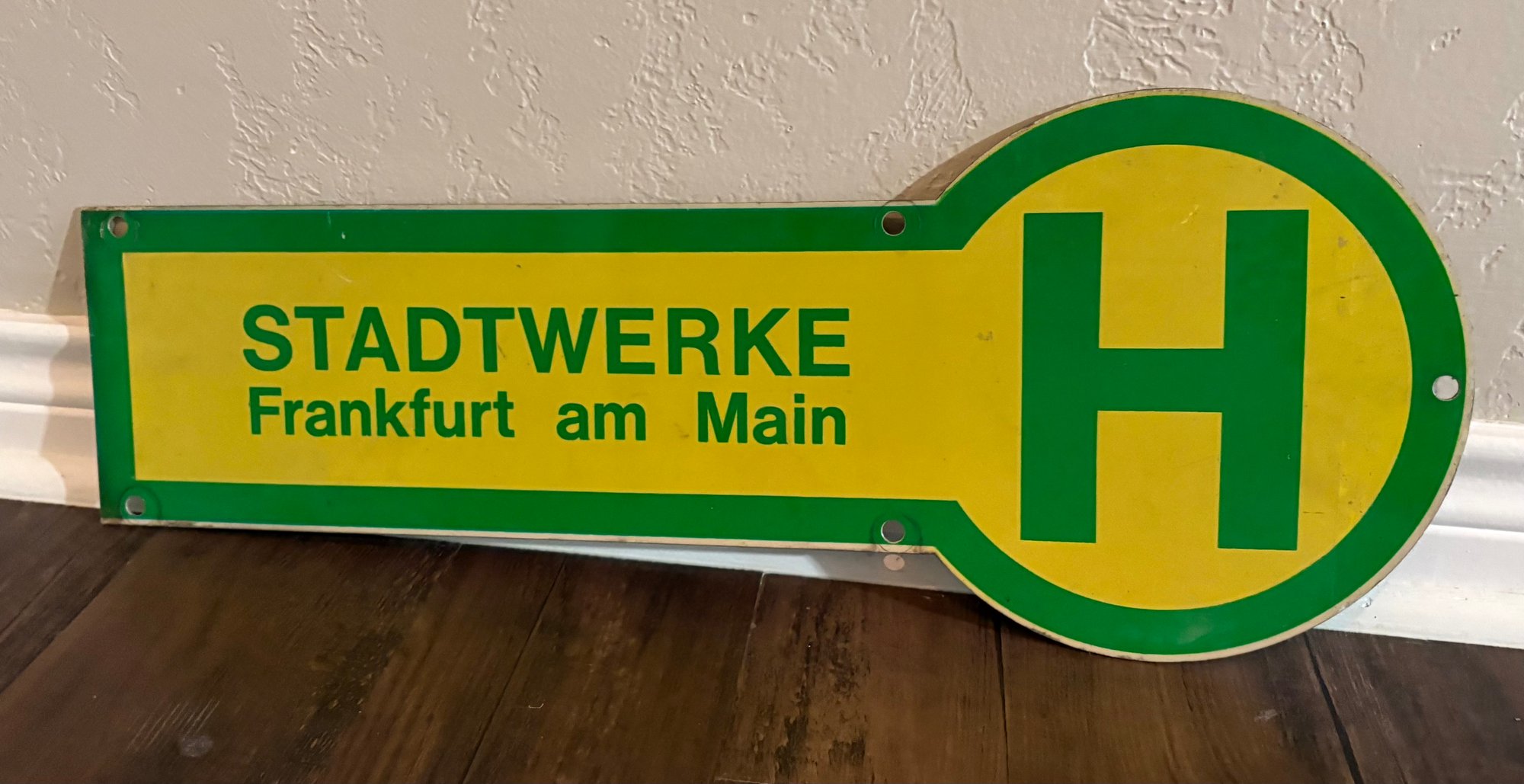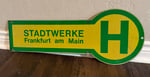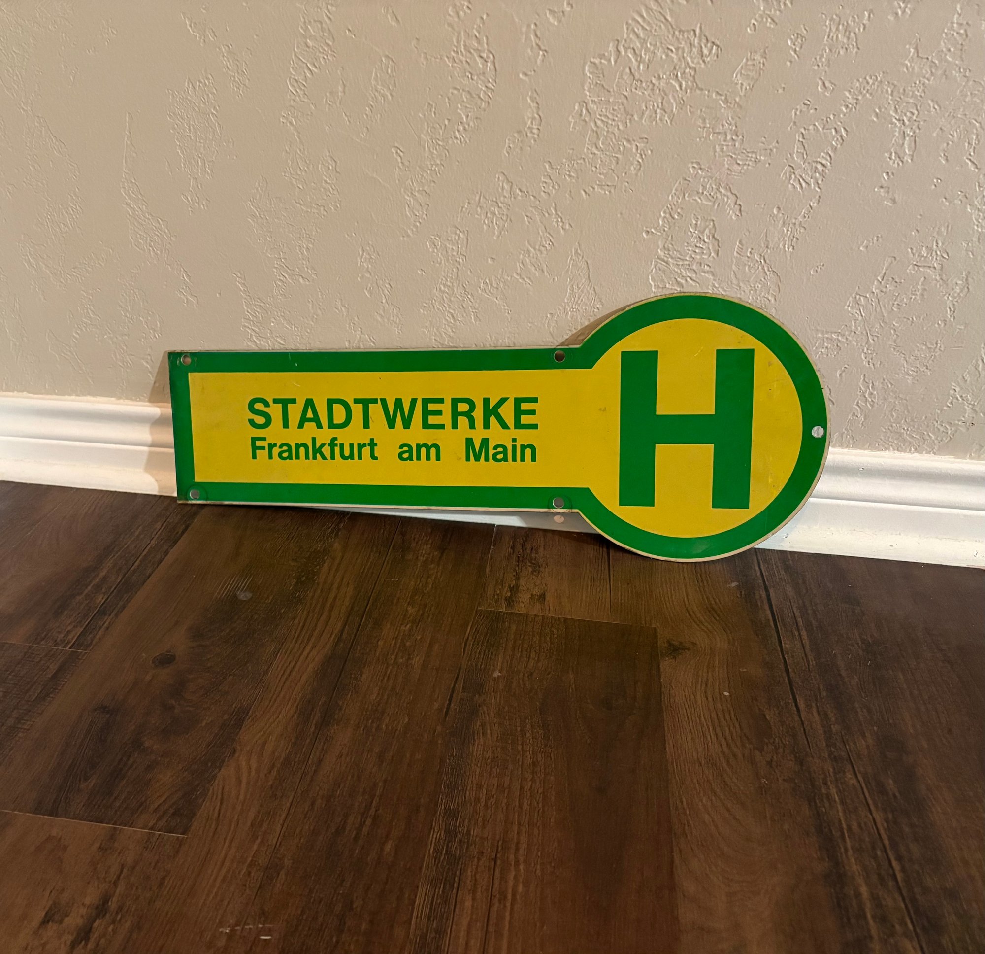 This is an authentic German aluminum Frankfurt city bus stop sign. The sign carries the name Stadtwerke , indicating the name of the bus stop at the "City Works" in Frankfurt, Germany.