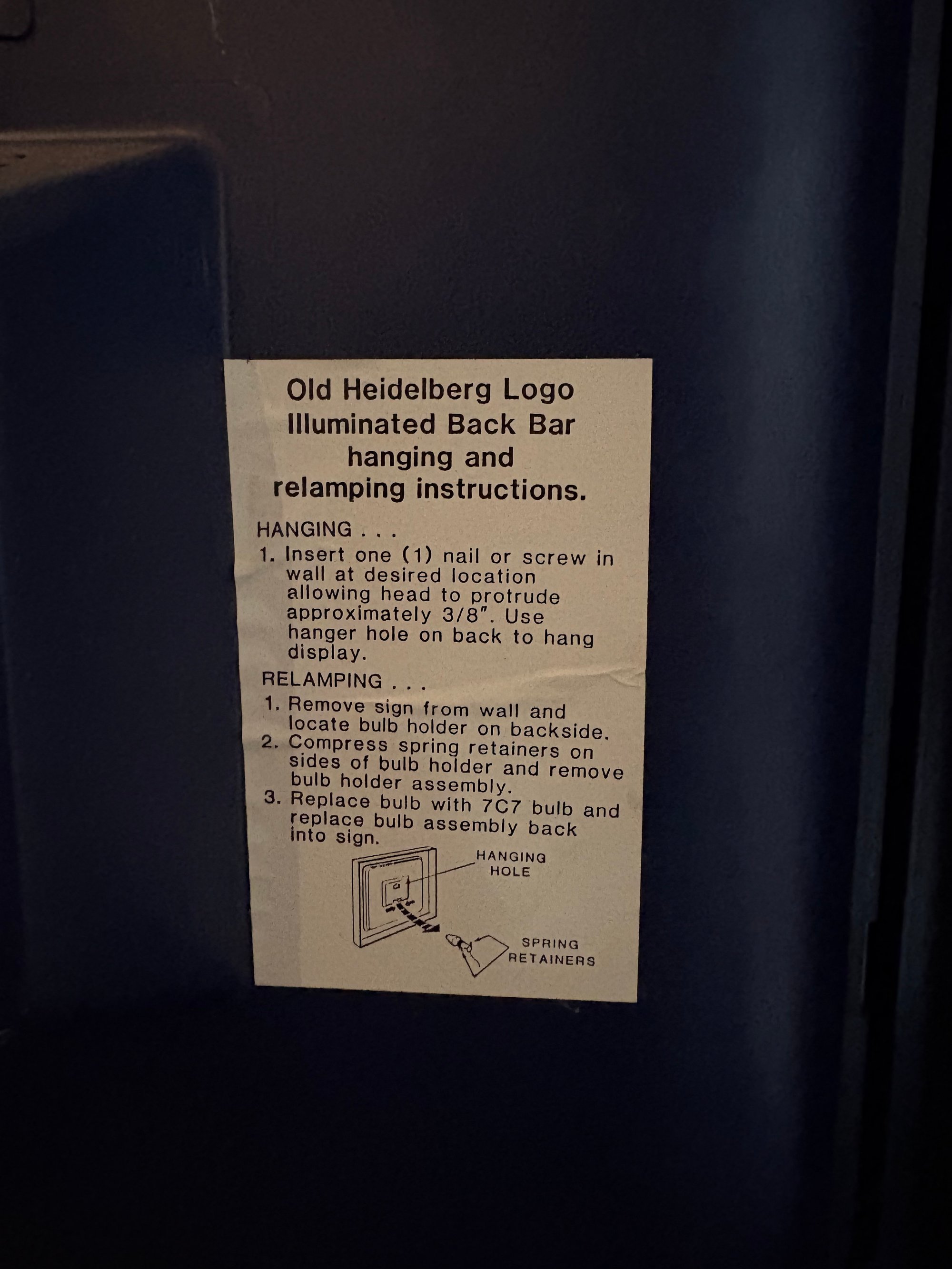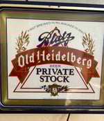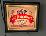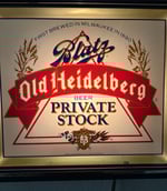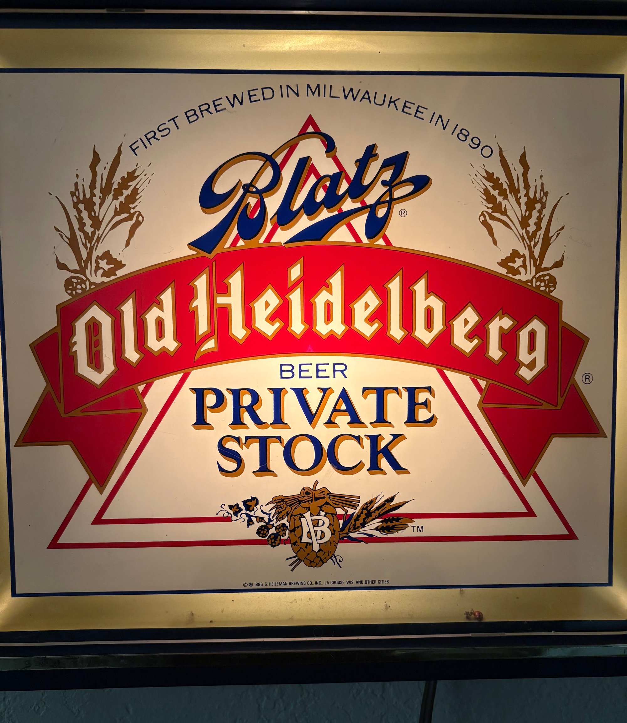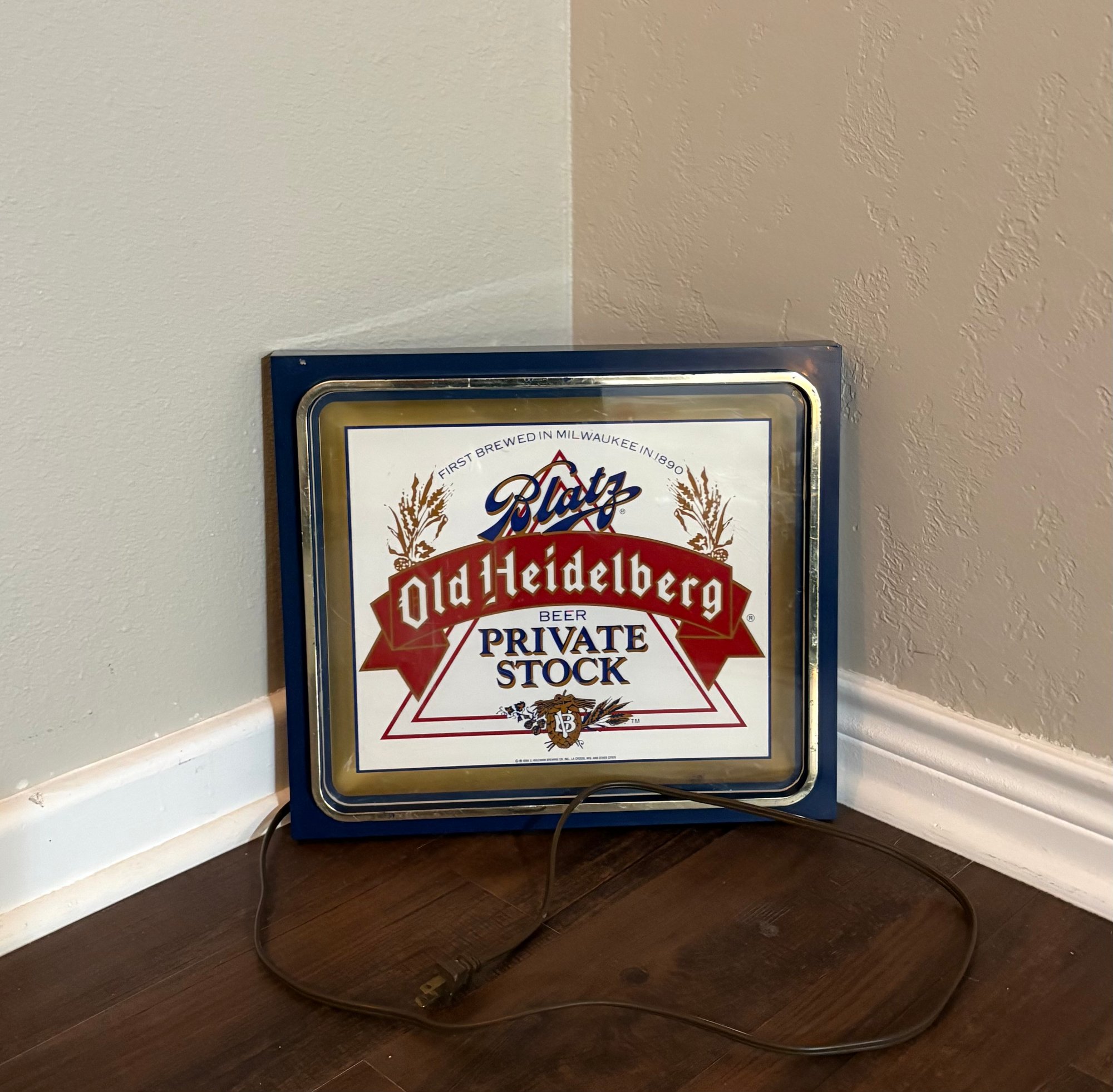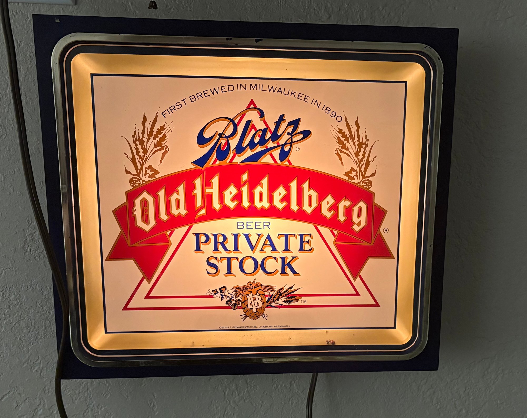 This is an authentic Blatz Old Heidelberg, "Private Stock" lighted beer sign. The sign is made of heavy plastic which can be hung on a wall & features a lighted display using a bulb w/spring retainers. The beer was brewed by the Blatz Brewing Company & the sign is a vintage ca. 1986. It measures approximately 14"H x 16"L.