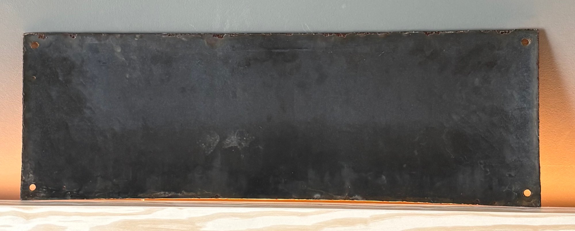 The sign is convex with a significant & solid covering of enamel with a glossy finish. It’s a solid, medium weight piece with minimal, visible "patina" or rust around the mounting holes. It features black sans-serif script on a white background with a thin black border. Standard age wear consistent with age should be expected. Please review photos carefully.