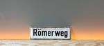 This is an authentic vintage German enamel street sign, Römerweg (Roman Way), a classic example of historical German street signage common in German-speaking regions. Because of Germany's extensive Roman history, many roads with this name follow the routes of ancient Roman roads, including the cities of Berlin, Frankfurt and some areas of Austria, Switzerland, & others.