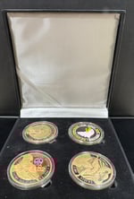 Iron/zinc alloy base with 24kt gold plating & measuring approximately 1.60" in diameter and 3 mm thick. The coins are presented in a black velvet-lined display box with each coin protected in a clear acrylic capsule.