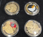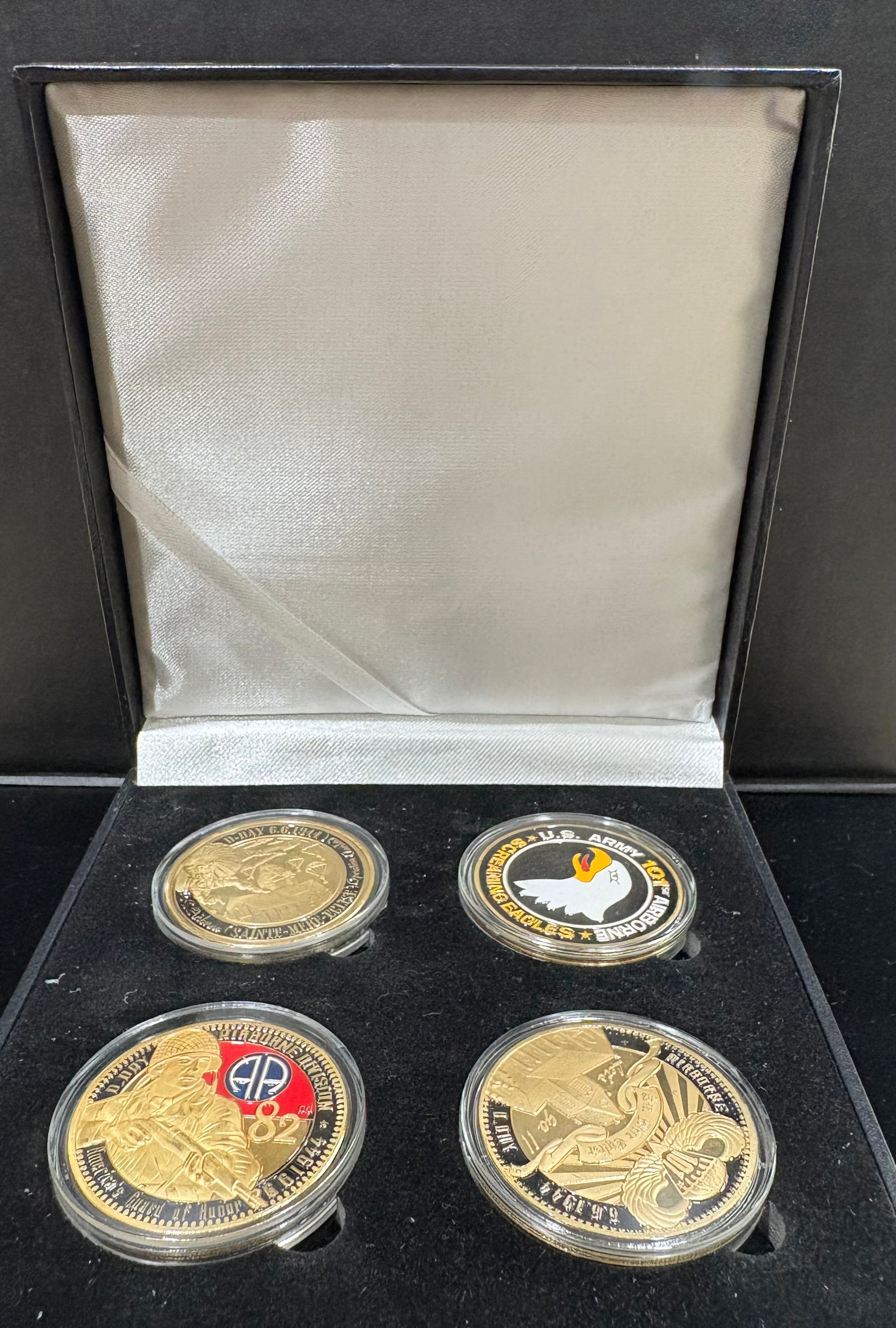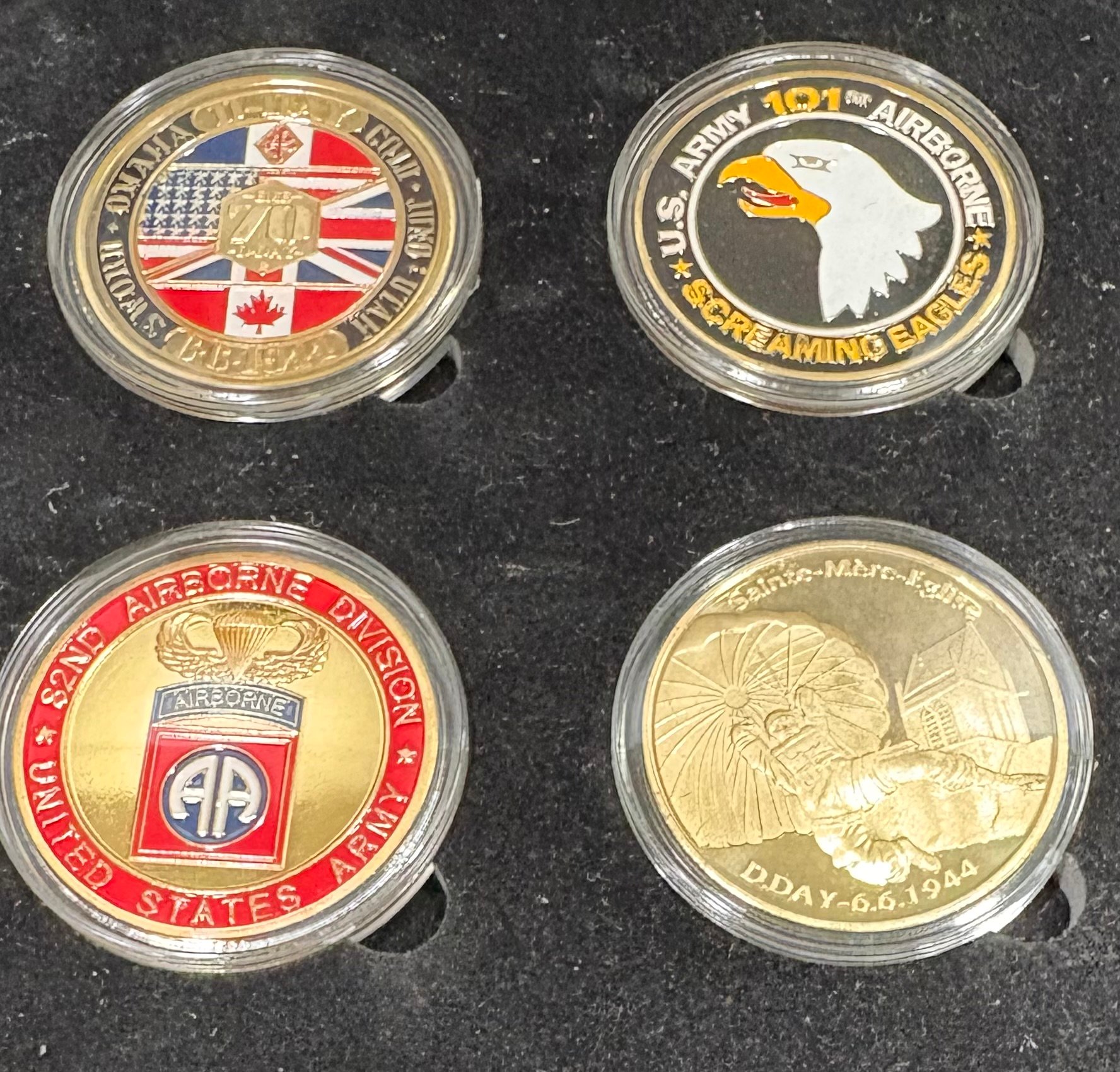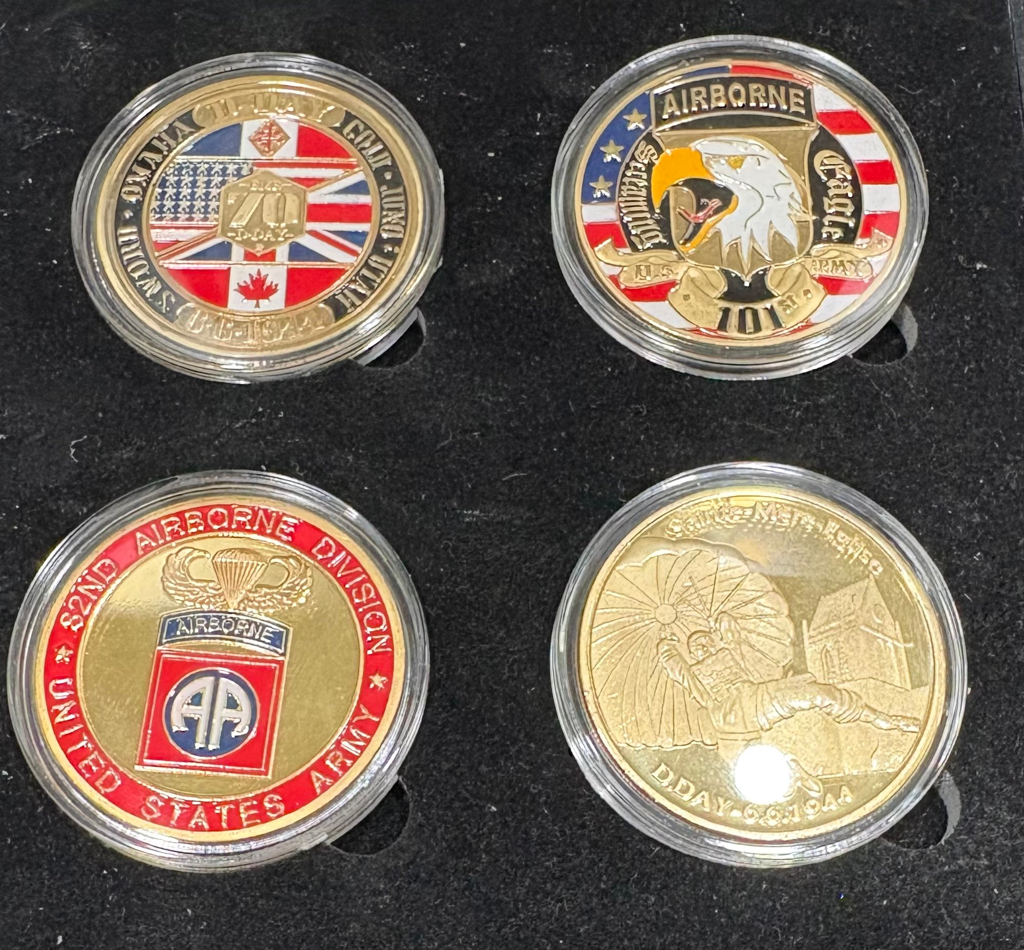 This is a commemorative collection of gold-plated challenge coins honoring the 101st and 82nd Airborne Divisions and their role in the D-Day landings of World War II presented in a nicely designed black velvet-lined display box with each coin contained within a clear acrylic capsule.