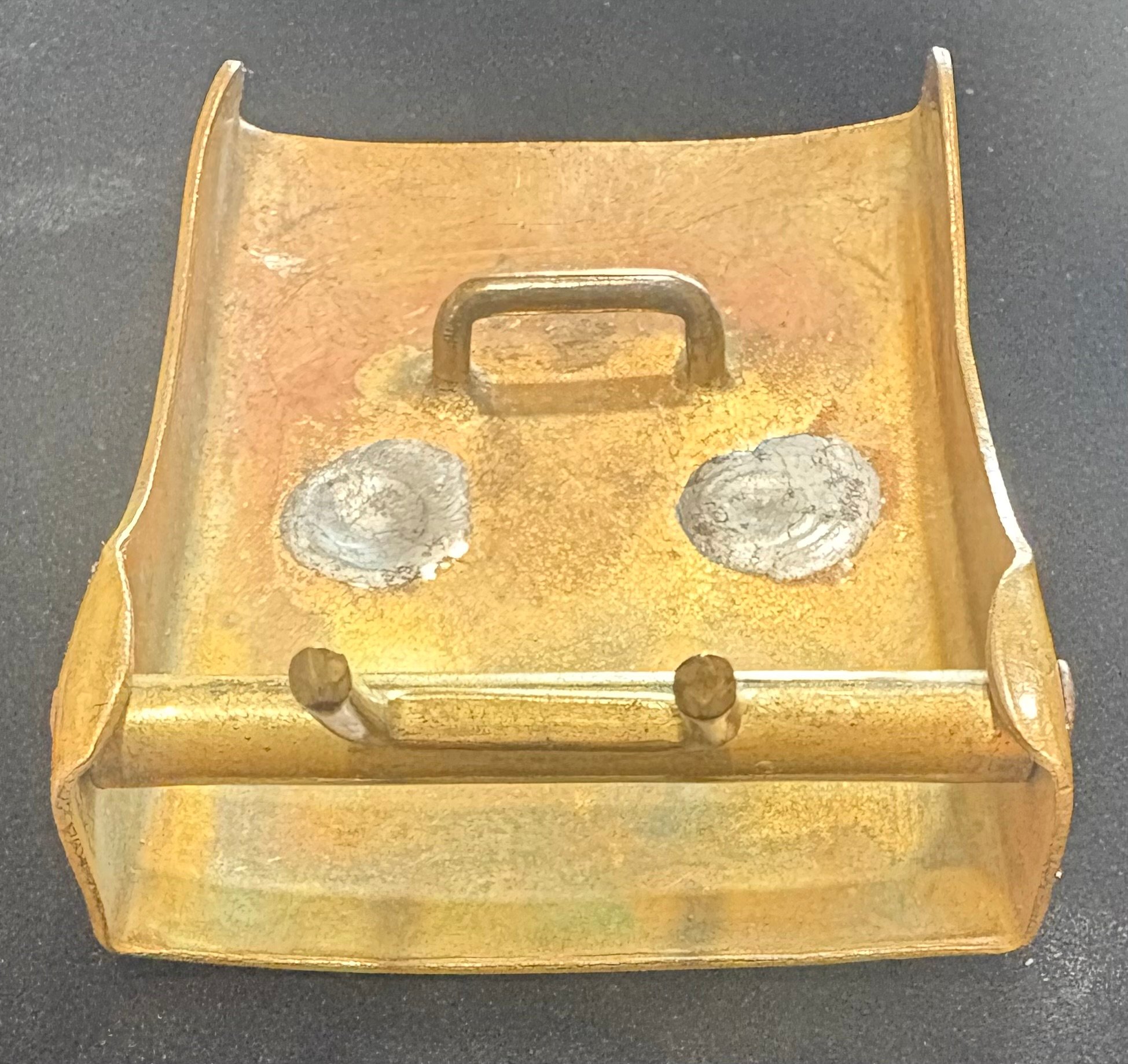 Constructed of brass w/the center medallion of nickel silver, soldered on separately.
