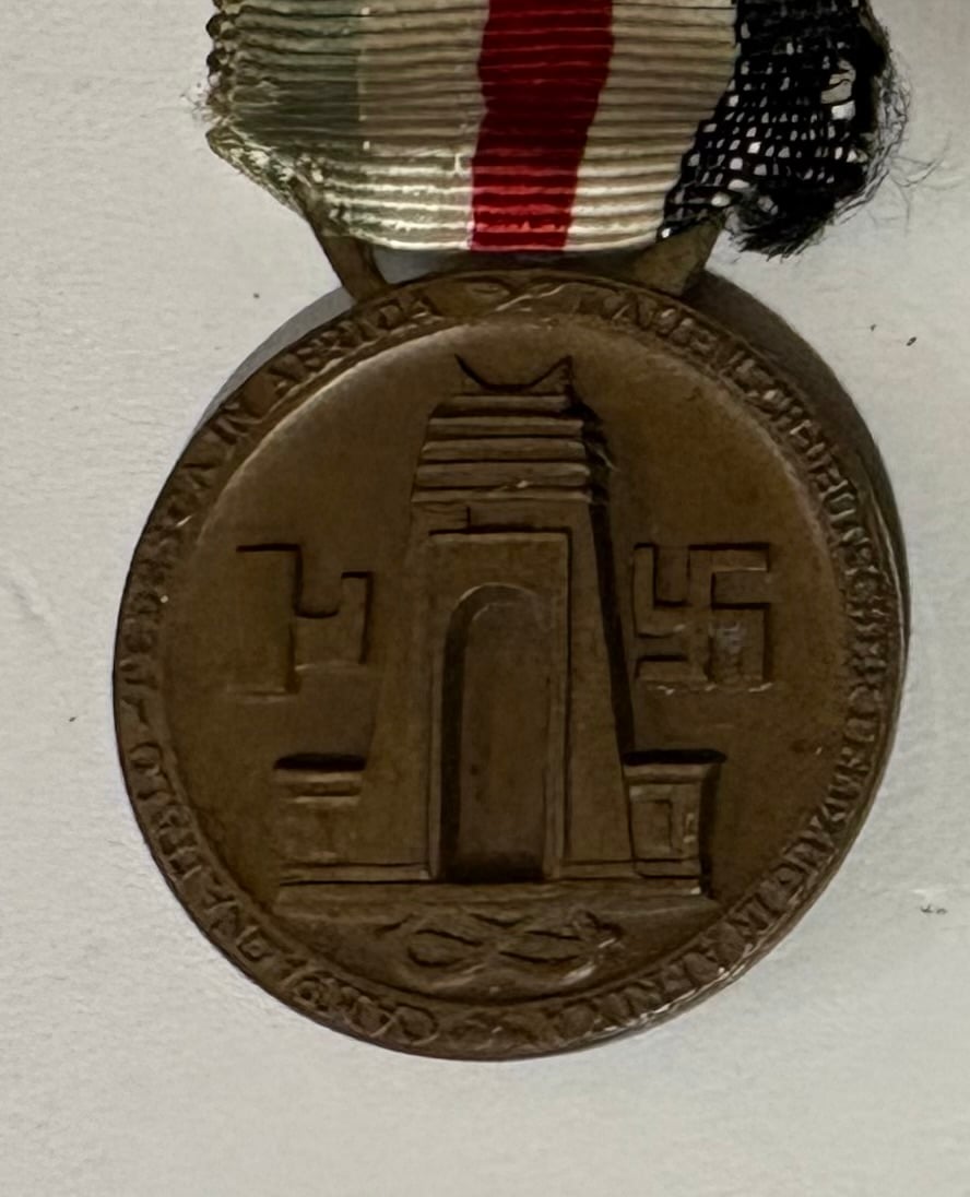 This is an authentic WW2 Italian/Nazi Germany African campaign medal commemorating the actions of Field Marshall Erwin Rommel's DAK, Deutsche Afrika Korps (German Africa Corps) & symbolized the alliance between Italy & Germany in the North African theater. It was instituted by Benito Mussolini in the spring of 1942 as a foreign war decoration.