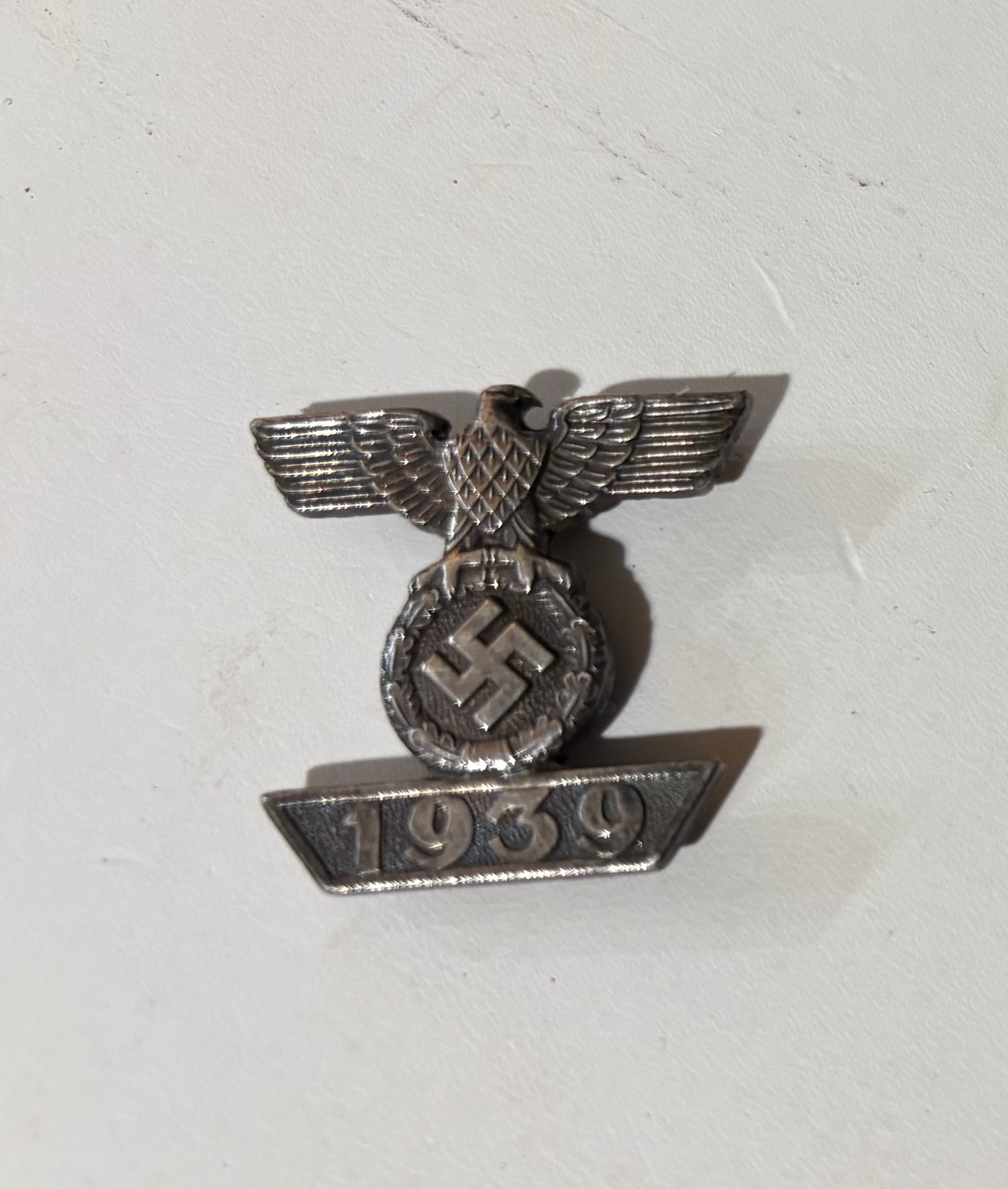 Obverse - The spread winged eagle clutching a wreath with central swastika, above a trapezoidal “1939” date panel. The clasp appears to be silver construction, with some of the original silver wash worn, leaving an even dark gray to brown patina typical of period used and/or aged examples. Details to the eagle, wreath, and date remain clearly visible despite the finish loss.