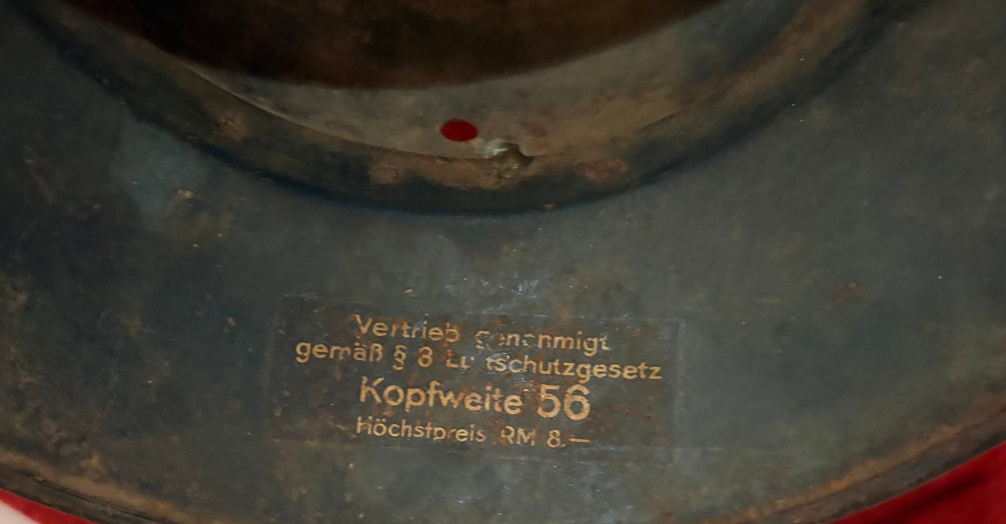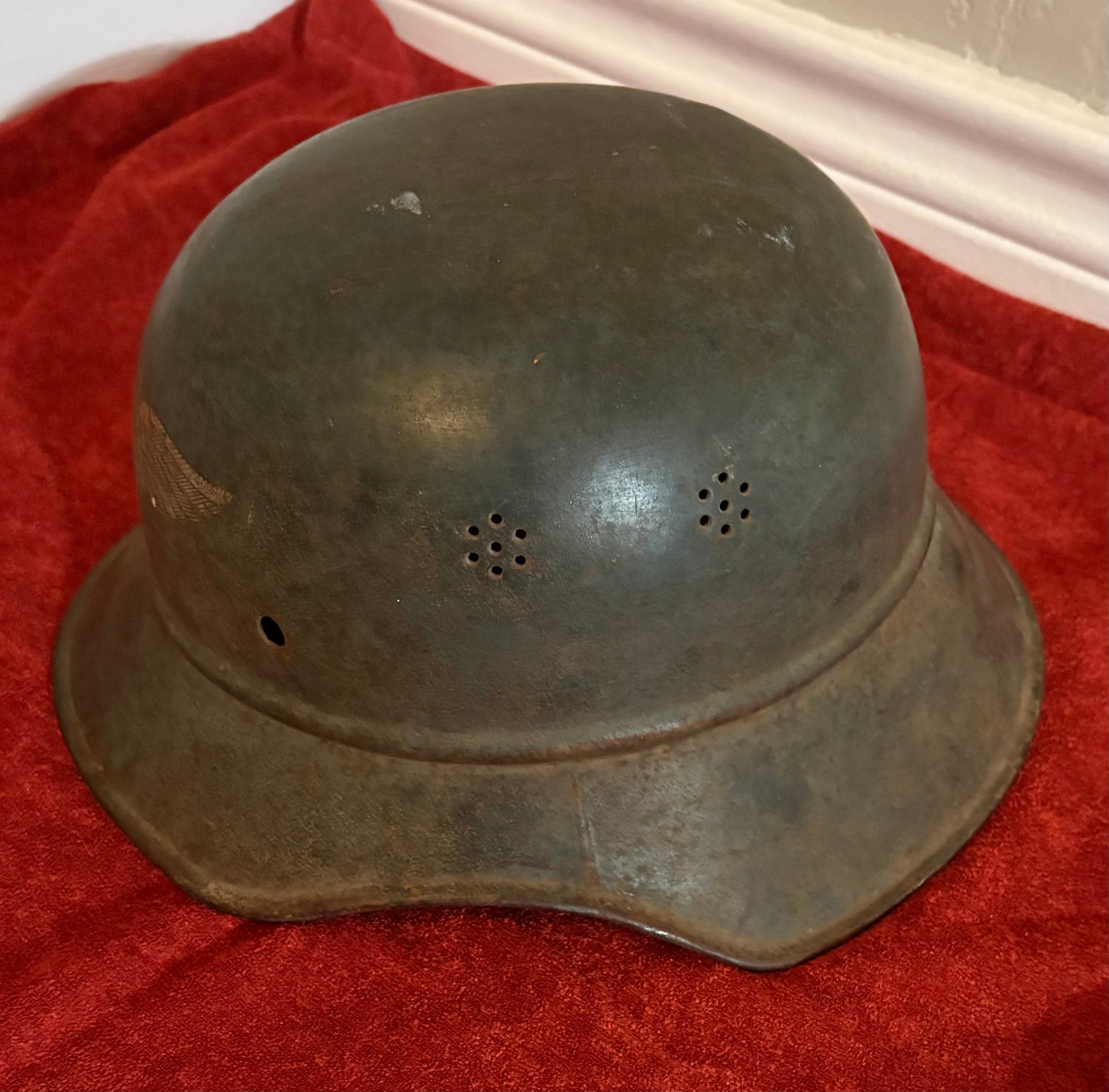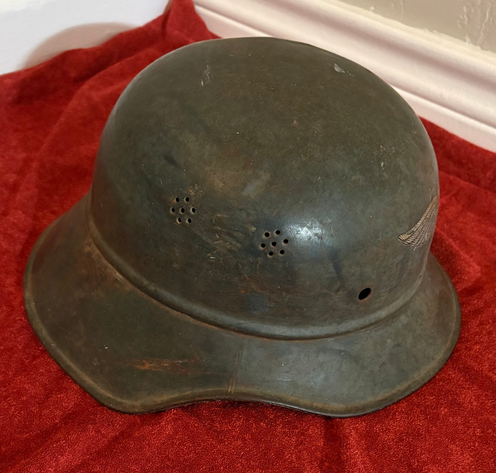 Three piece, stamped, sheet-steel construction w/an embossed, horizontal, beaded rim between the crown and the visor/neck guard. The visor/neck guard has a semi-circular "ear" cut-out. The front center is emblazoned w/the Luftschutz emblem nearly fully intact & visible. The detailed, silver decal features stylized spread wings with a central oak-leaf sprig and a canted swastika positioned below a scripted banner, "Luftschutz". There are two groups of seven "salt & pepper" ventilation holes to either side of the crown.