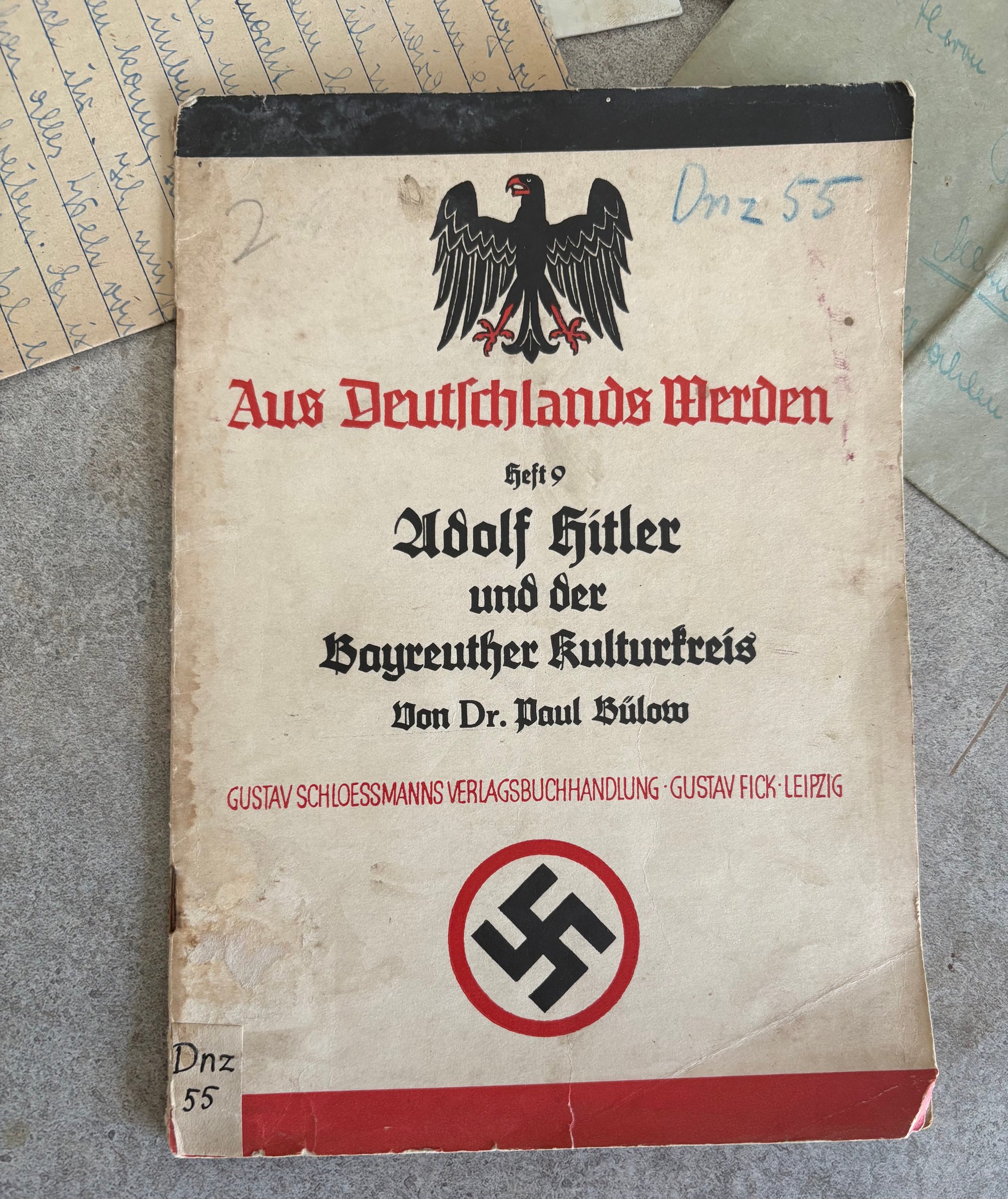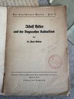 The booklet dates to the mid-1930s (ca. 1933-1935 timeframe) & published in Leipzig. It's a historical Nazi era piece drawing a connection between Adolf Hitler & the cultural environment of the Bayreuth Festival, which was famously associated with the composer Richard Wagner. Works like this were used to associate the Nazi regime with established German cultural figures and ideals.