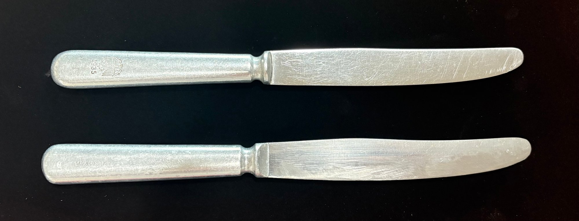 These are authentic combo stainless steel & aluminum dinner knives of Nazi Germany. One knife features an engraved national eagle & the production year "1935" while the other is stamped "W.P. & CO S.37 indicating the manufacturer and the year of production (1937). These engraving styles (the eagle) and the 1935 date are characteristic of items produced during the rearmament of the German military in the mid-1930s.