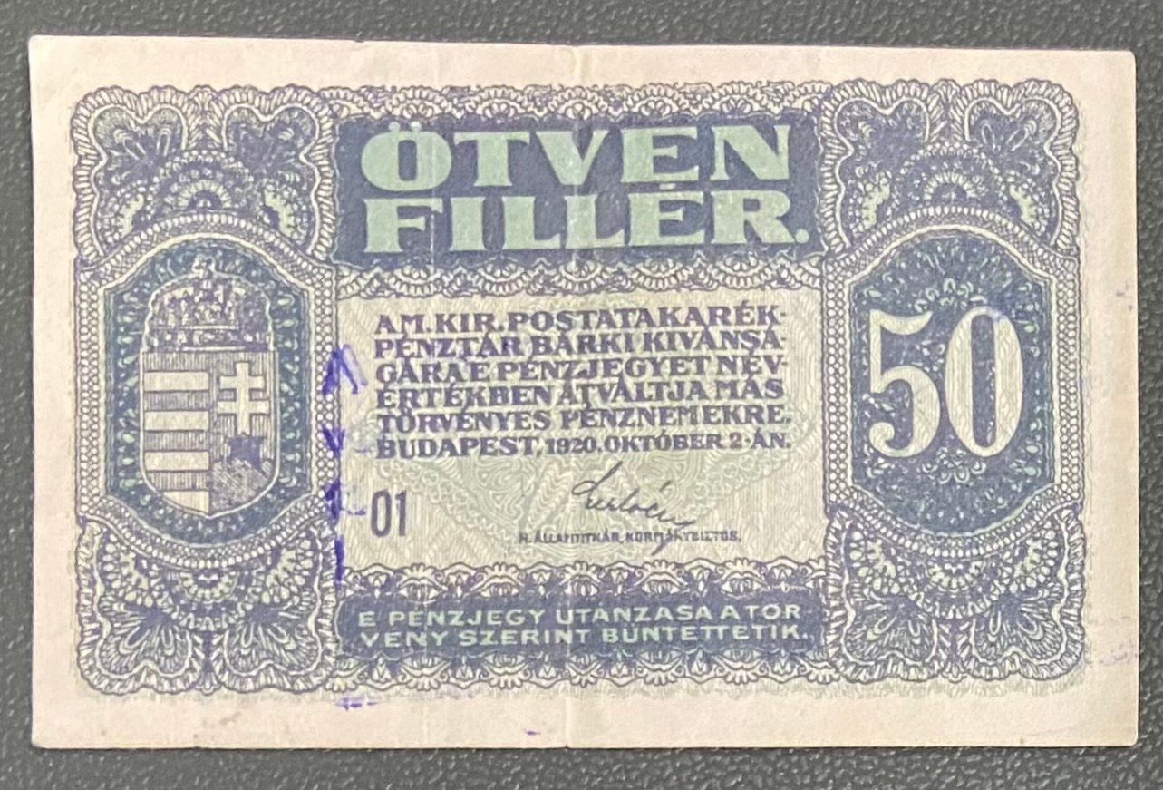 This is an authentic Hungarian, 50 Filler banknote. It was issued on 2 October 1920 by Magyar Postatakarékpénztár (Hungarian Post Office Savings Bank).