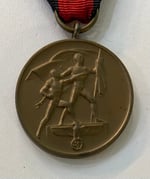 This is an authentic, period piece 1938 Sudetenland Medal, otherwise known officially as the "Commemorative Medal of 1st October 1938". Introduced on 18 October 1938, it commemorates the German occupation of Czechoslovakia. It was awarded to civilians and military personnel who participated in the “return” of the Sudetenland to Germany.