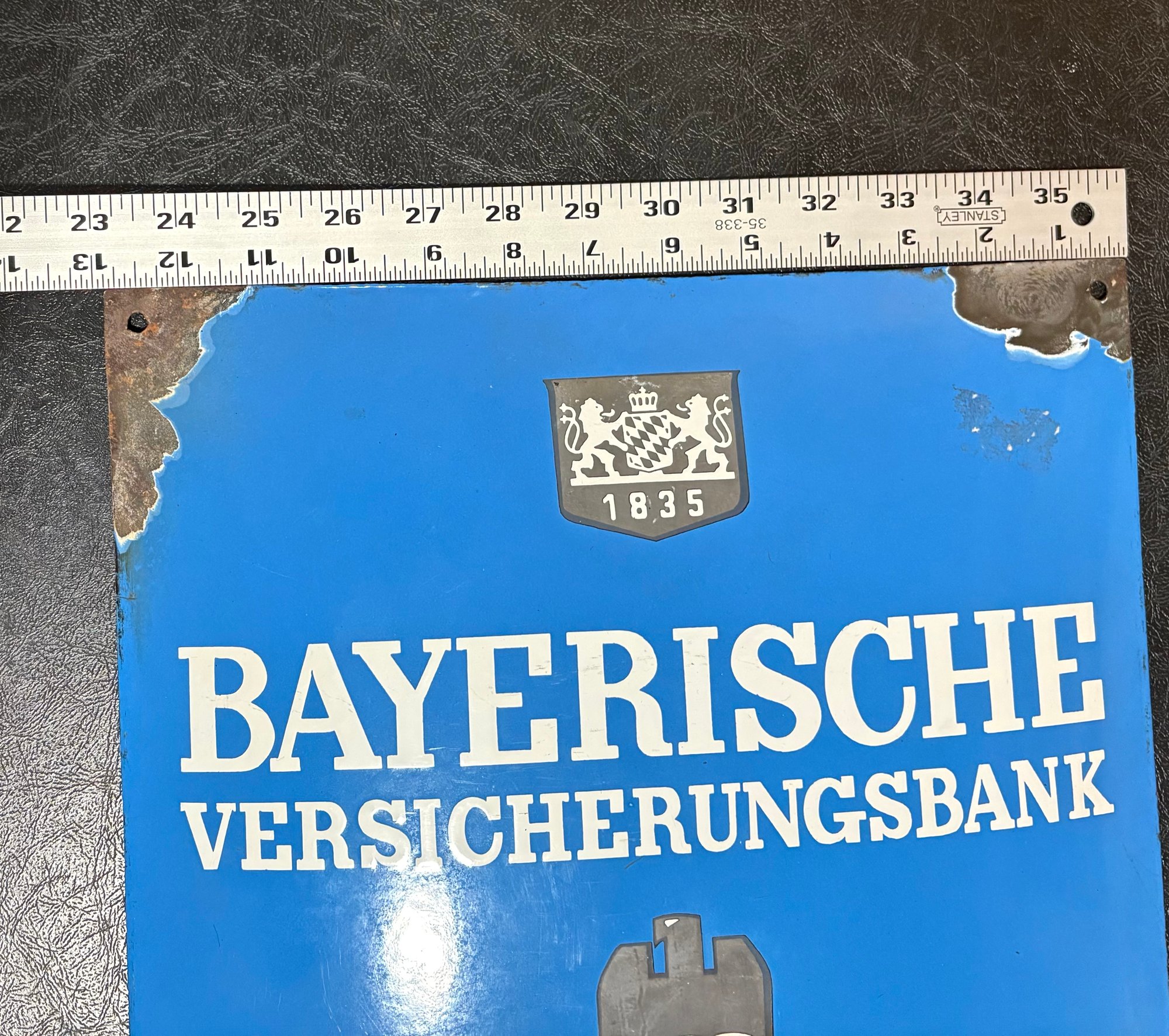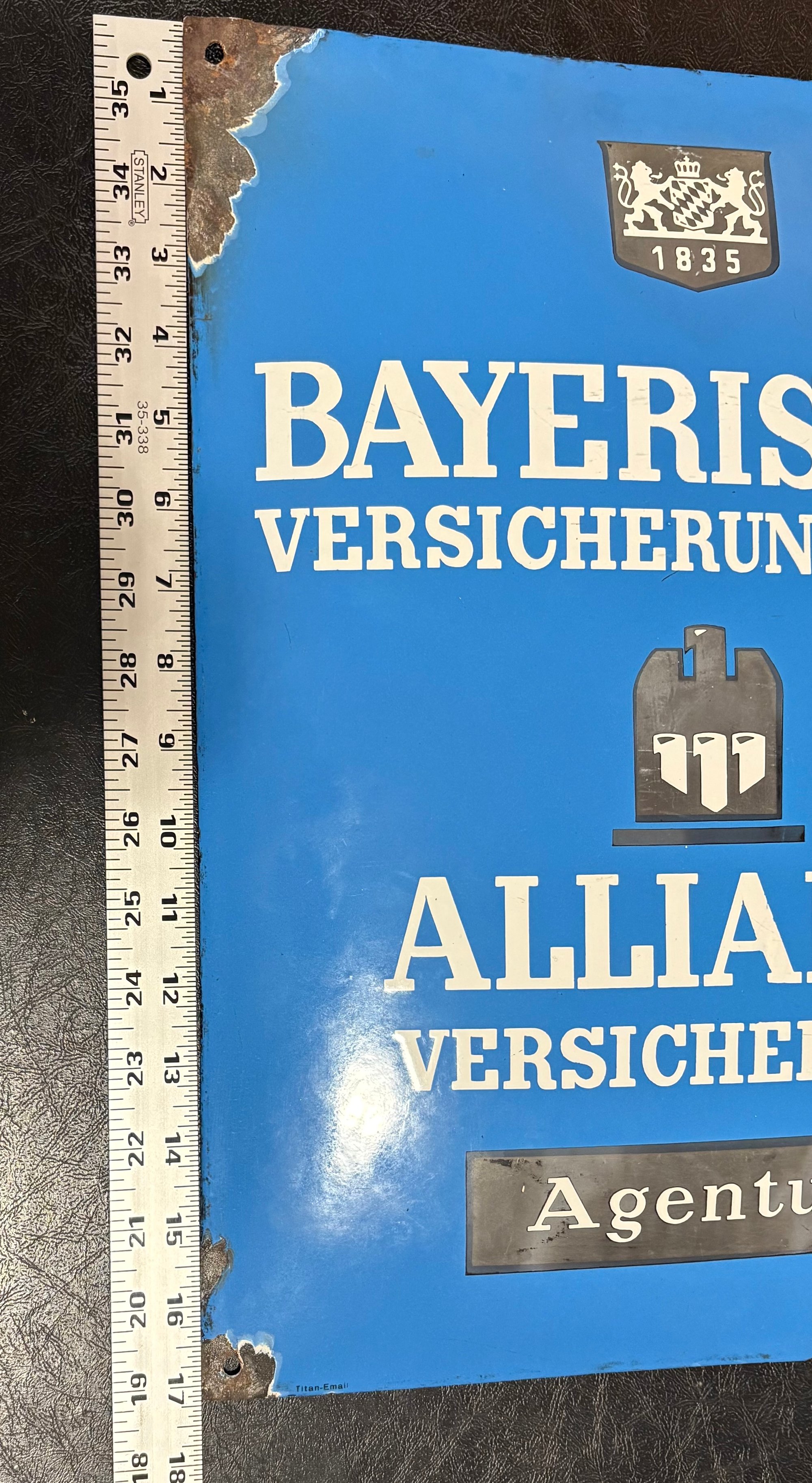 This is an authentic vintage German enamel sign for “Bayerische Versicherungsbank Allianz Versicherung Agentur”. (Bavarian Insurance Bank Allianz Insurance Agency).