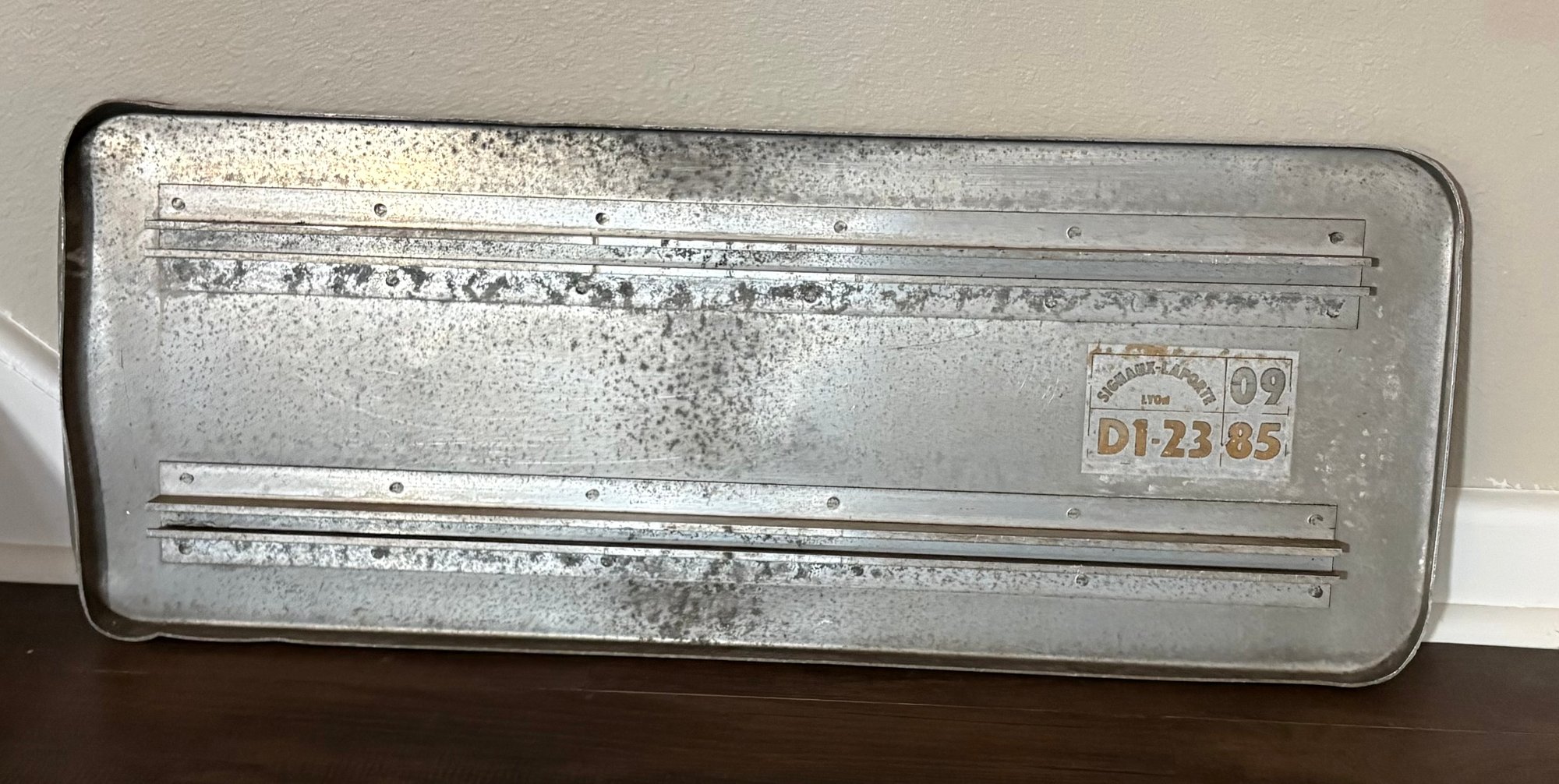 The sign surface is flat but curves around its perimeter giving it a solid, heavy duty presentation. It’s a solid, heavy weight piece presenting standard age wear scuffs, scratches, and markings. The red border is reflective & does contain faint "graffiti", in both French & German writing, within its boundary. The reverse stamp dates the production of this sign ca. September 1985 by "Laporte Signals" of Lyon, France. Standard age wear consistent with its age should be expected. Please review photos carefully.