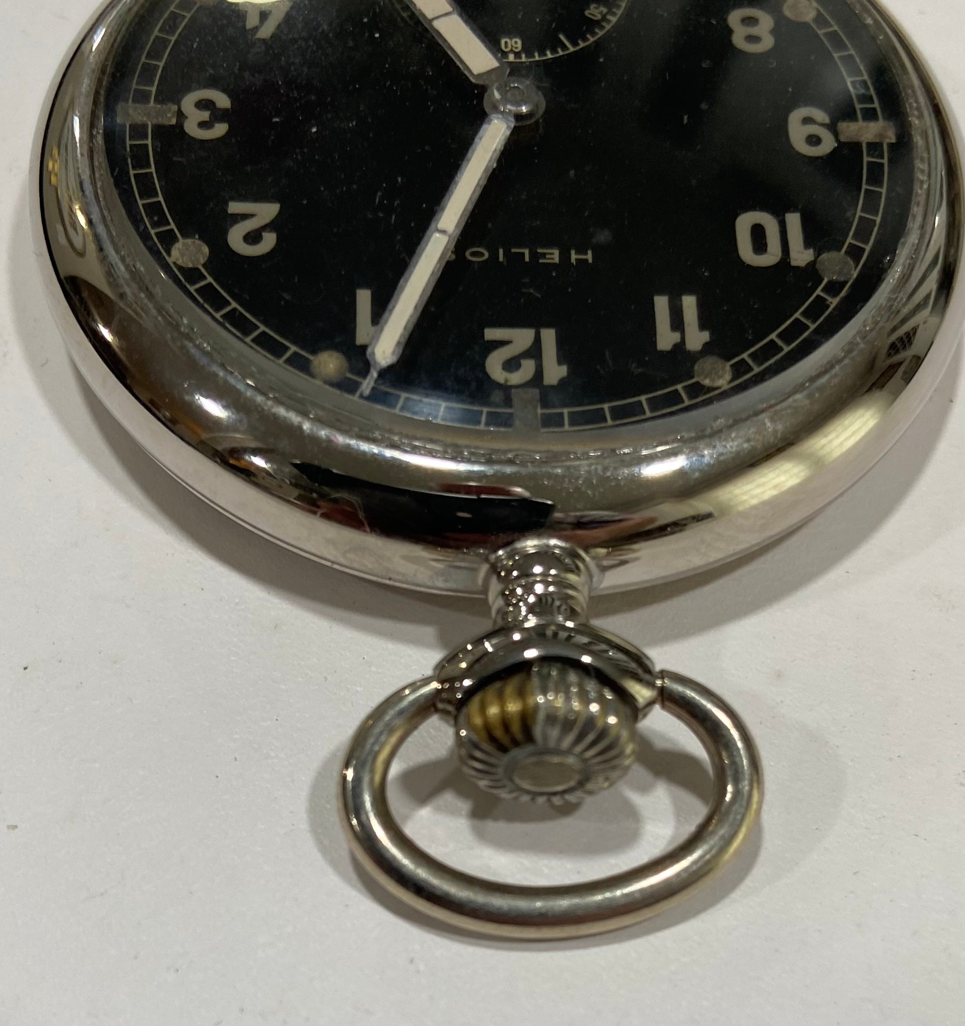 This is an authentic WW2 Nazi Germany Wehrmacht issued Helios Pocket Watch. The pocket watch comes complete with a framed document certification dated 27 December 1944. Produced by the German company Helois, it was intended for command personnel of the Wehrmacht ground forces.