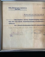 The framed document was provided by the 334th Infantry Division to a Wehrmacht soldier conveying a brand new pocket watch, now considered his private property as a result of his personal private watch being destroyed by enemy action.